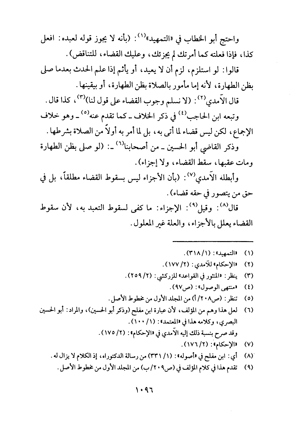 وأبطله الْآمِدِيّ: (بِأَن الْأَجْزَاء لَيْسَ بِسُقُوط الْقَضَاء مُطلقًا، بل فِي حق من يتَصَوَّر فِي حَقه قَضَاء) .