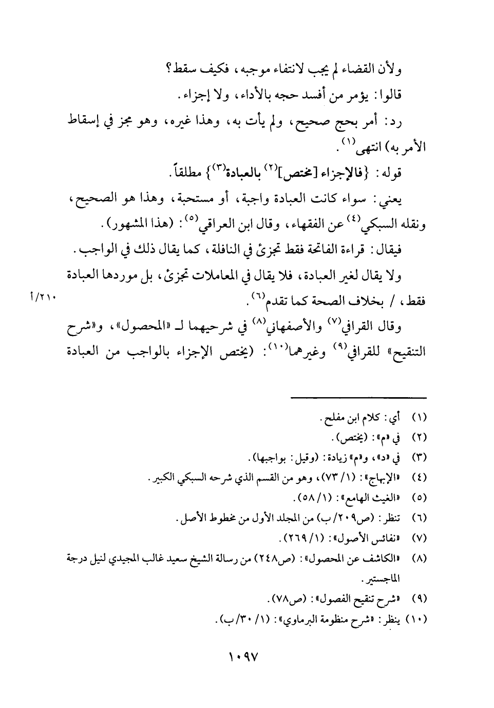 وَقَالَ الْقَرَافِيّ والأصفهاني فِي شرحيهما ل " الْمَحْصُول "، و " شرح التَّنْقِيح " للقرافي وَغَيرهمَا: (يخْتَص الْإِجْزَاء بِالْوَاجِبِ من الْعِبَادَة