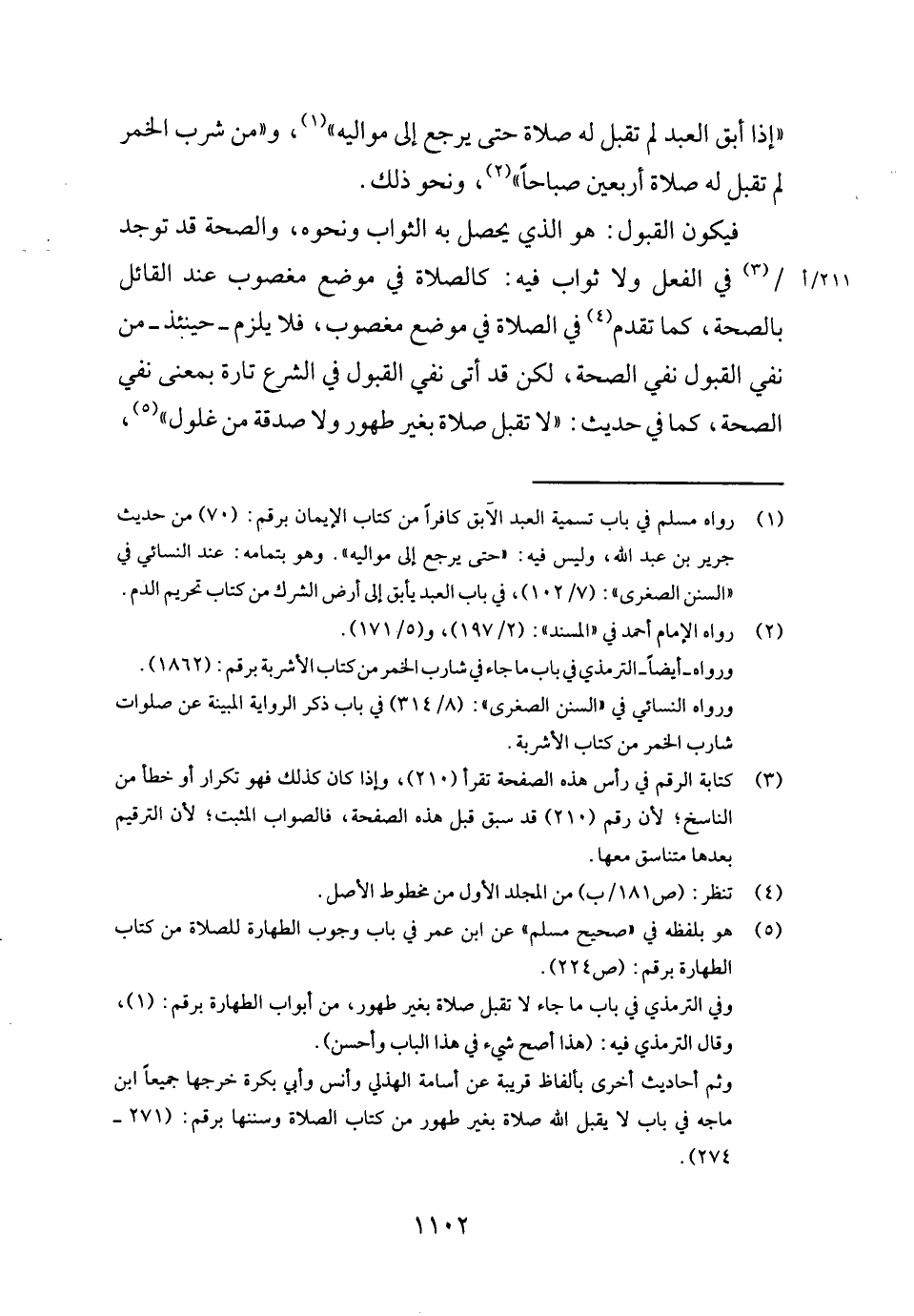 " إِذا أبق العَبْد لم تقبل لَهُ صَلَاة حَتَّى يرجع إِلَى موَالِيه "، و " من شرب الْخمر لم تقبل لَهُ صَلَاة أَرْبَعِينَ صباحا "، وَنَحْو ذَلِك.