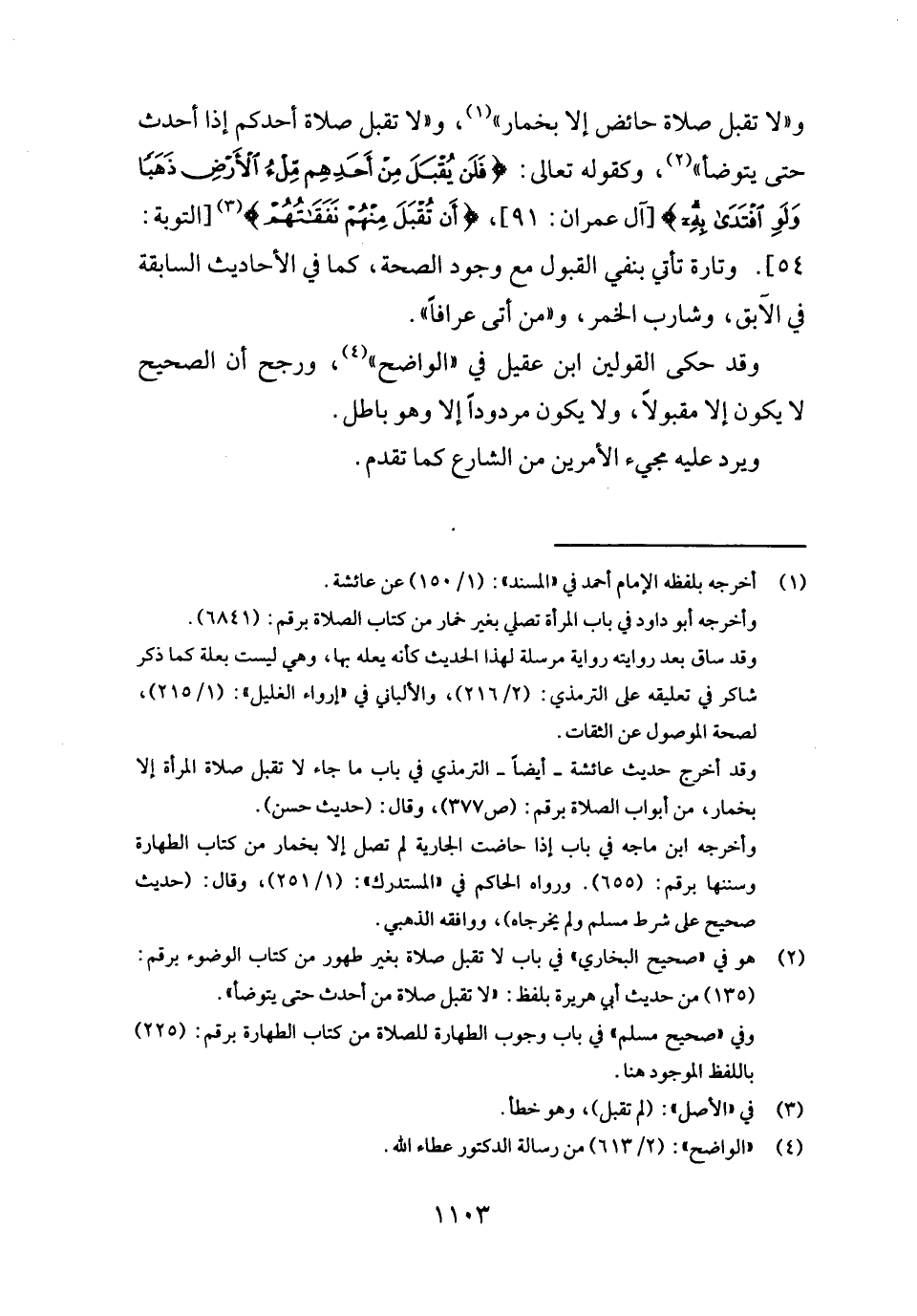 و " لَا تقبل صَلَاة حَائِض إِلَّا بخمار "، و " لَا تقبل صَلَاة أحدكُم إِذا أحدث حَتَّى يتَوَضَّأ "، وَكَقَوْلِه تَعَالَى: {فَلَنْ يقبل من أحدهم ملْء الأَرْض ذَهَبا وَلَو افتدى بِهِ} [آل عمرَان: ٩١] ، {أَن تقبل مِنْهُم نفقاتهم} [التَّوْبَة: ٥٤] . وَتارَة تَأتي بِنَفْي الْقبُول مَعَ وجود الصِّحَّة، كَمَا فِي الْأَحَادِيث السَّابِقَة فِي الْآبِق، وشارب الْخمر، و " من أَتَى عرافا ".