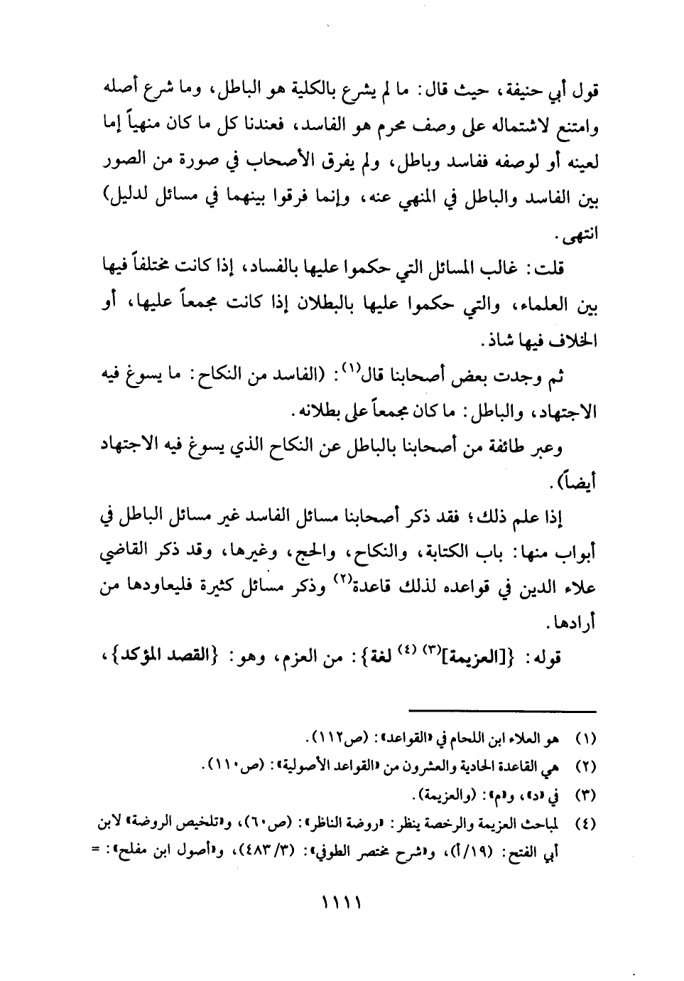 قَول أبي حنيفَة، حَيْثُ قَالَ: مَا لم يشرع بِالْكُلِّيَّةِ هُوَ الْبَاطِل، وَمَا شرع أَصله وَامْتنع لاشْتِمَاله على وصف محرم هُوَ الْفَاسِد، فعندنا كل مَا كَانَ مَنْهِيّا إِمَّا لعَينه أَو لوصفه ففاسد وباطل، وَلم يفرق الْأَصْحَاب فِي صُورَة من الصُّور بَين الْفَاسِد وَالْبَاطِل فِي الْمنْهِي عَنهُ، وَإِنَّمَا فرقوا بَينهمَا فِي مسَائِل لدَلِيل) انْتهى.