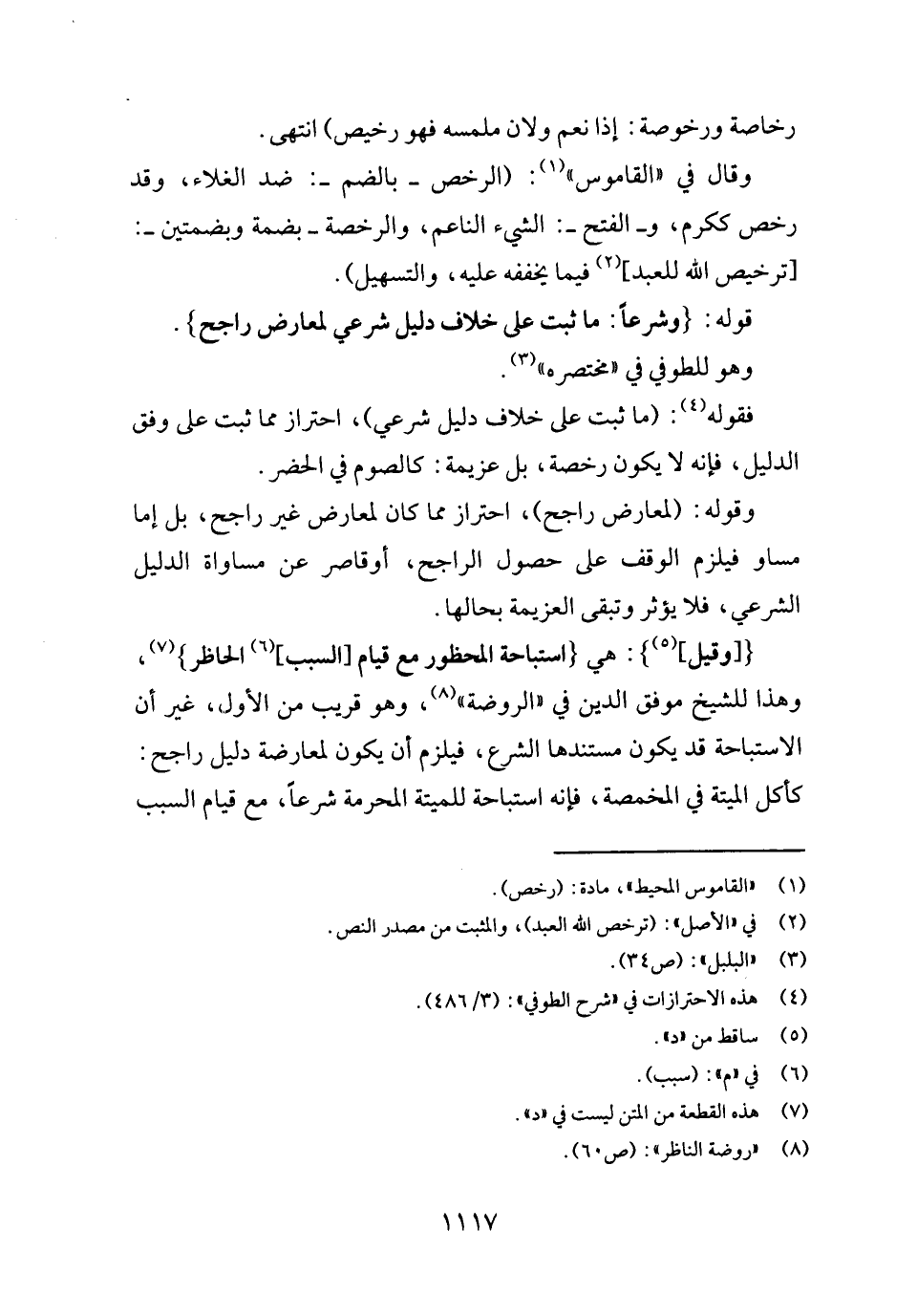{ [وَقيل] } : هِيَ {اسْتِبَاحَة الْمَحْظُور مَعَ قيام [السَّبَب] الحاظر} ، وَهَذَا للشَّيْخ موفق الدّين فِي " الرَّوْضَة "، وَهُوَ قريب من الأول، غير أَن الاستباحة قد يكون مستندها الشَّرْع، فَيلْزم أَن يكون لمعارضة دَلِيل رَاجِح: كَأَكْل الْميتَة فِي المخمصة، فَإِنَّهُ اسْتِبَاحَة للميتة الْمُحرمَة شرعا، مَعَ قيام السَّبَب