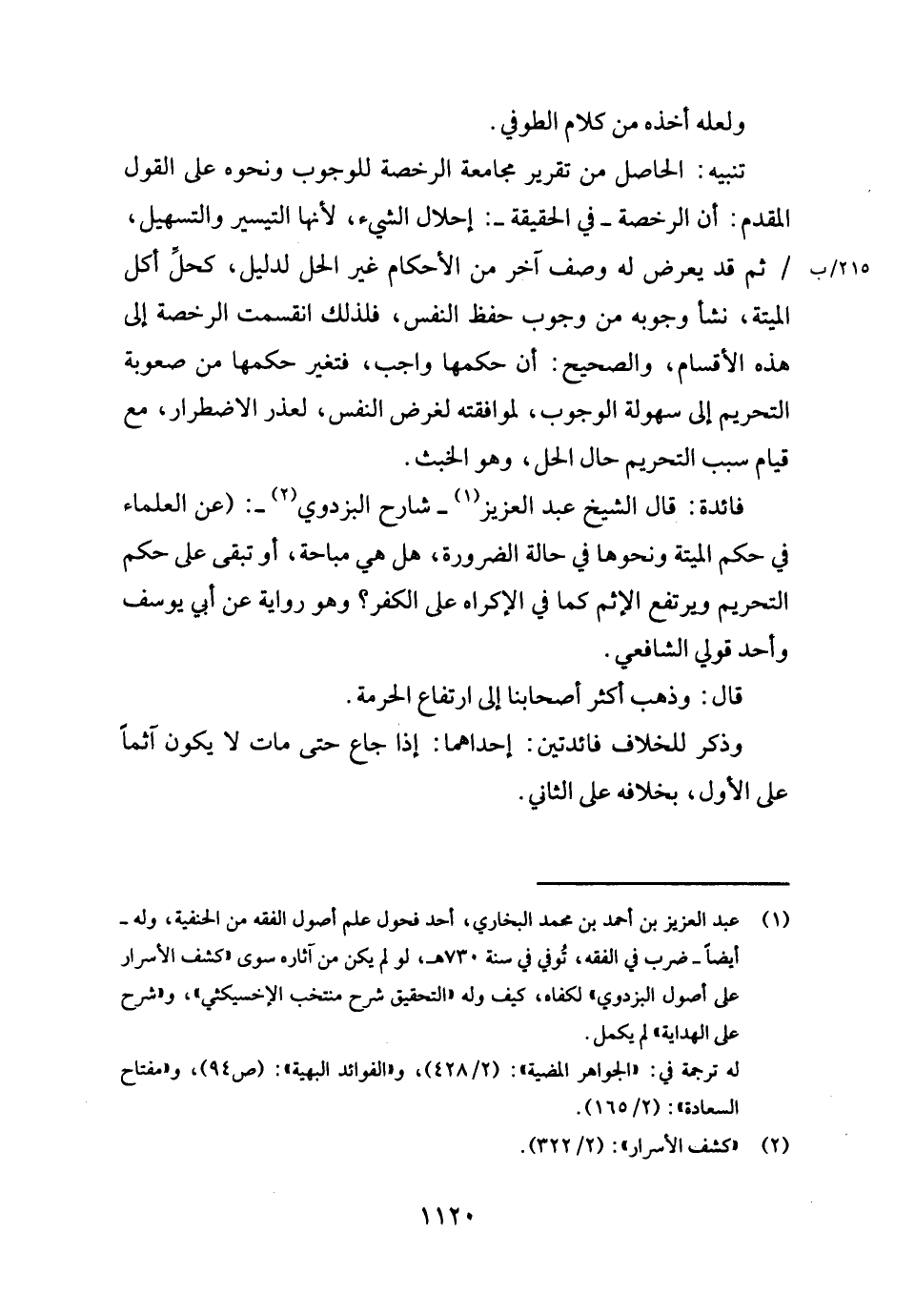 فَائِدَة: قَالَ الشَّيْخ عبد الْعَزِيز - شَارِح الْبَزْدَوِيّ -: (عَن الْعلمَاء فِي حكم الْميتَة وَنَحْوهَا فِي حَالَة الضَّرُورَة، هَل هِيَ مُبَاحَة، أَو تبقى على حكم التَّحْرِيم ويرتفع الْإِثْم كَمَا فِي الْإِكْرَاه على الْكفْر؟ وَهُوَ رِوَايَة عَن أبي يُوسُف وَأحد قولي الشَّافِعِي.
