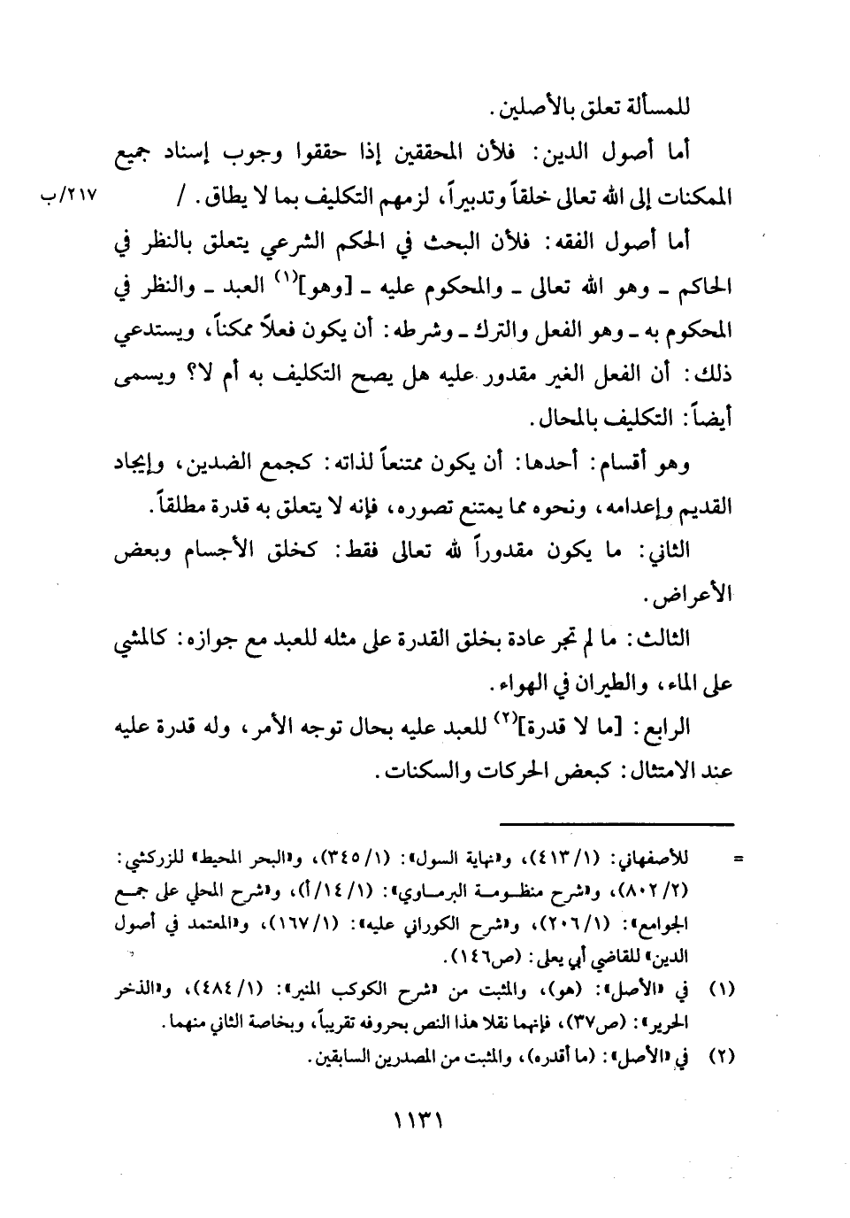 أما أصُول الدّين: فَلِأَن الْمُحَقِّقين إِذا حققوا وجوب إِسْنَاد جَمِيع الممكنات إِلَى الله تَعَالَى خلقا وتدبيرا، لَزِمَهُم التَّكْلِيف بِمَا لَا يُطَاق.