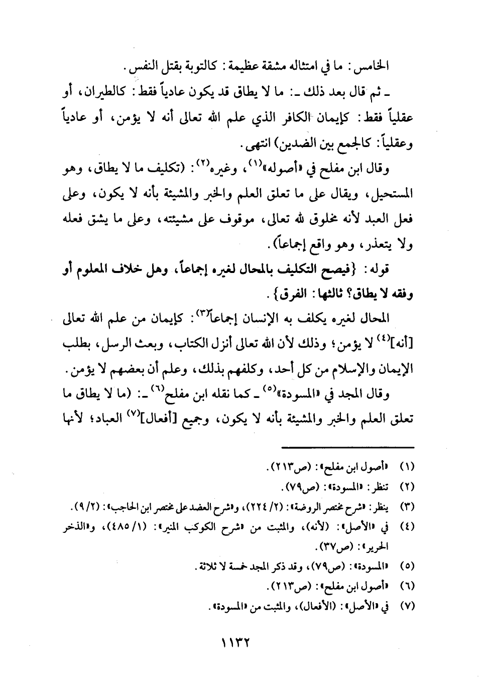 وَقَالَ ابْن مُفْلِح فِي " أُصُوله "، وَغَيره: (تَكْلِيف مَا لَا يُطَاق، وَهُوَ المستحيل، وَيُقَال على مَا تعلق الْعلم وَالْخَبَر والمشيئة بِأَنَّهُ لَا يكون، وعَلى فعل العَبْد لِأَنَّهُ مَخْلُوق لله تَعَالَى، مَوْقُوف على مَشِيئَته، وعَلى مَا يشق فعله وَلَا يتَعَذَّر، وَهُوَ وَاقع إِجْمَاعًا) .