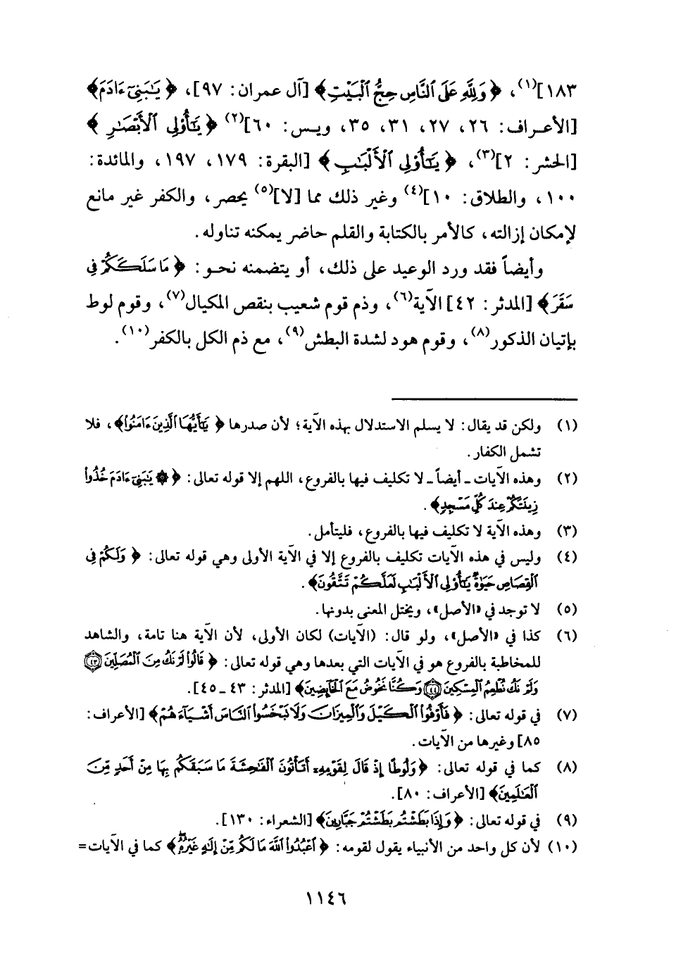 ١٨٣ -] ، {وَللَّه على النَّاس حج الْبَيْت} [آل عمرَان: ٩٧] ، {يَا بني آدم} [الْأَعْرَاف: ٢٦، ٢٧، ٣١، ٣٥، وَيس: ٦٠] {يَا أولي الْأَبْصَار} [الْحَشْر: ٢] ، {يَا أولي الْأَلْبَاب} [الْبَقَرَة: ١٧٩، ١٩٧، والمائدة: ١٠٠، وَالطَّلَاق: ١٠] وَغير ذَلِك مِمَّا [لَا] يحصر، وَالْكفْر غير مَانع لِإِمْكَان إِزَالَته، كالأمر بِالْكِتَابَةِ والقلم حَاضر يُمكنهُ تنَاوله.