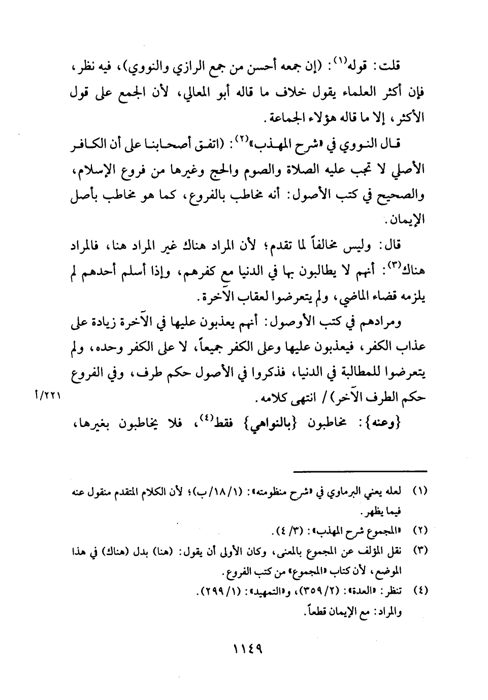 ومرادهم فِي كتب الْأُصُول: أَنهم يُعَذبُونَ عَلَيْهَا فِي الْآخِرَة زِيَادَة على عَذَاب الْكفْر، فيعذبون عَلَيْهَا وعَلى الْكفْر جَمِيعًا، لَا على الْكفْر وَحده، وَلم يتَعَرَّضُوا للمطالبة فِي الدُّنْيَا، فَذكرُوا فِي الْأُصُول حكم طرف، وَفِي الْفُرُوع حكم الطّرف الآخر) انْتهى كَلَامه.