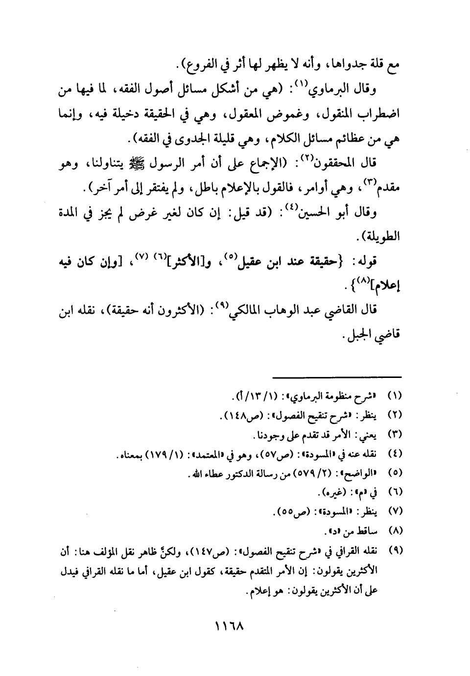 وَقَالَ الْبرمَاوِيّ: (هِيَ من أشكل مسَائِل أصُول الْفِقْه، لما فِيهَا من اضْطِرَاب الْمَنْقُول، وغموض الْمَعْقُول، وَهِي فِي الْحَقِيقَة دخيلة فِيهِ، وَإِنَّمَا هِيَ من عظائم مسَائِل الْكَلَام، وَهِي قَليلَة الجدوى فِي الْفِقْه) .