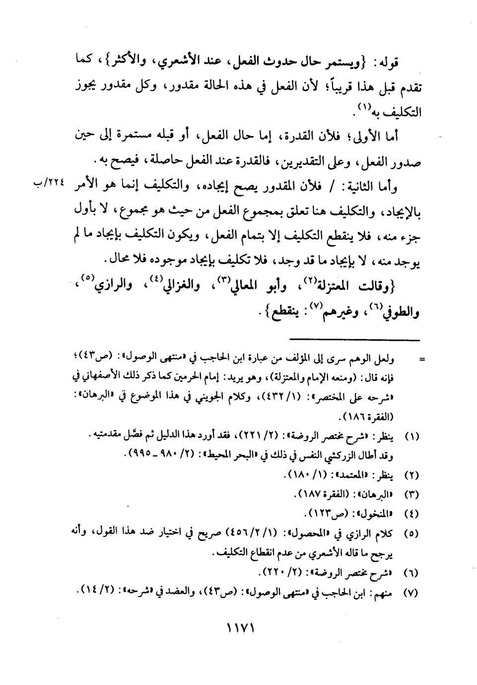 قَوْله: {وَيسْتَمر حَال حُدُوث الْفِعْل، عِنْد الْأَشْعَرِيّ، وَالْأَكْثَر} ، كَمَا تقدم قبل هَذَا قَرِيبا؛ لِأَن الْفِعْل فِي هَذِه الْحَالة مَقْدُور، وكل مَقْدُور يجوز التَّكْلِيف بِهِ.