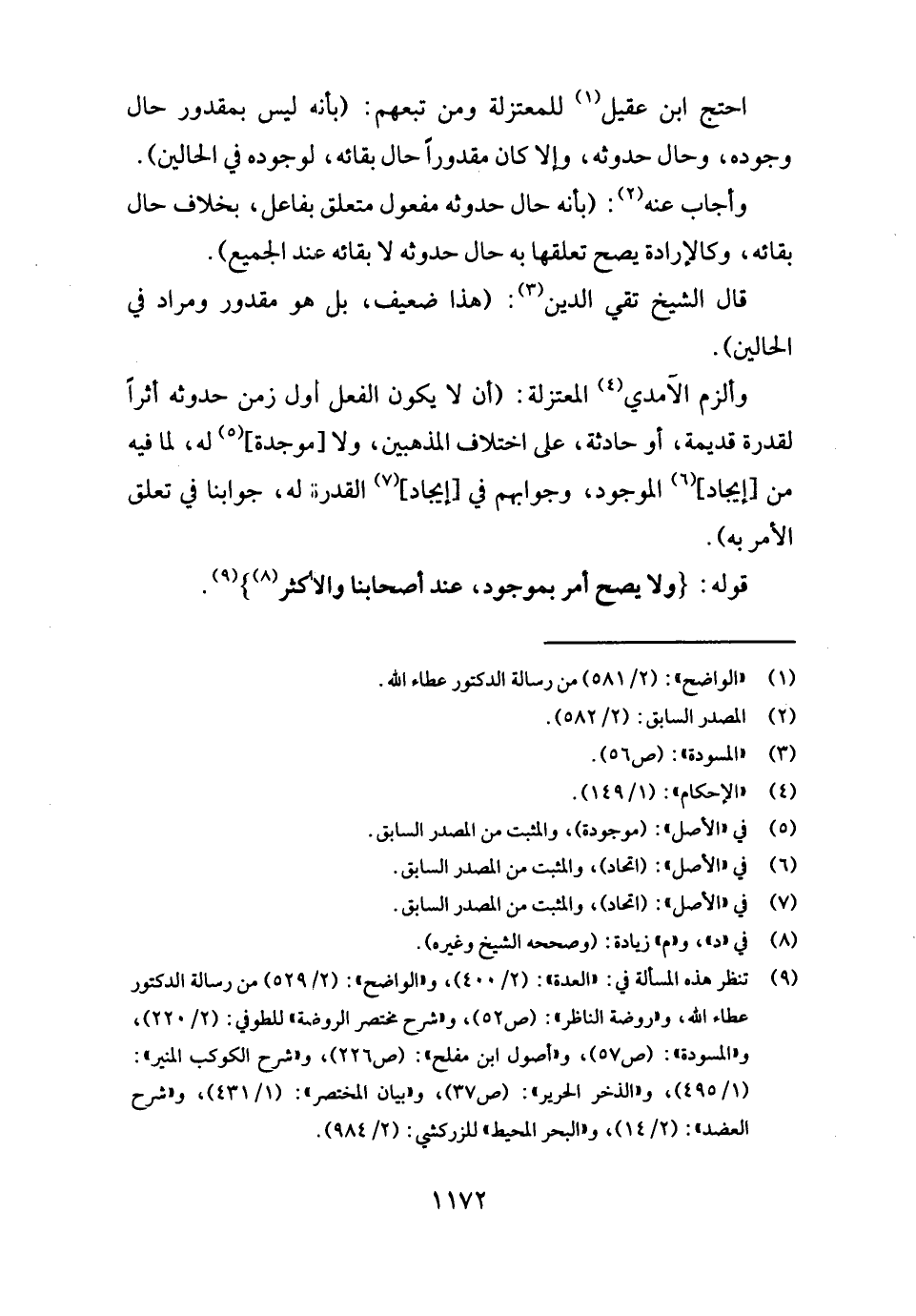 احْتج ابْن عقيل للمعتزلة وَمن تَبِعَهُمْ: (بِأَنَّهُ لَيْسَ بمقدور حَال وجوده، وَحَال حُدُوثه، وَإِلَّا كَانَ مَقْدُورًا حَال بَقَائِهِ، لوُجُوده فِي الْحَالين) .