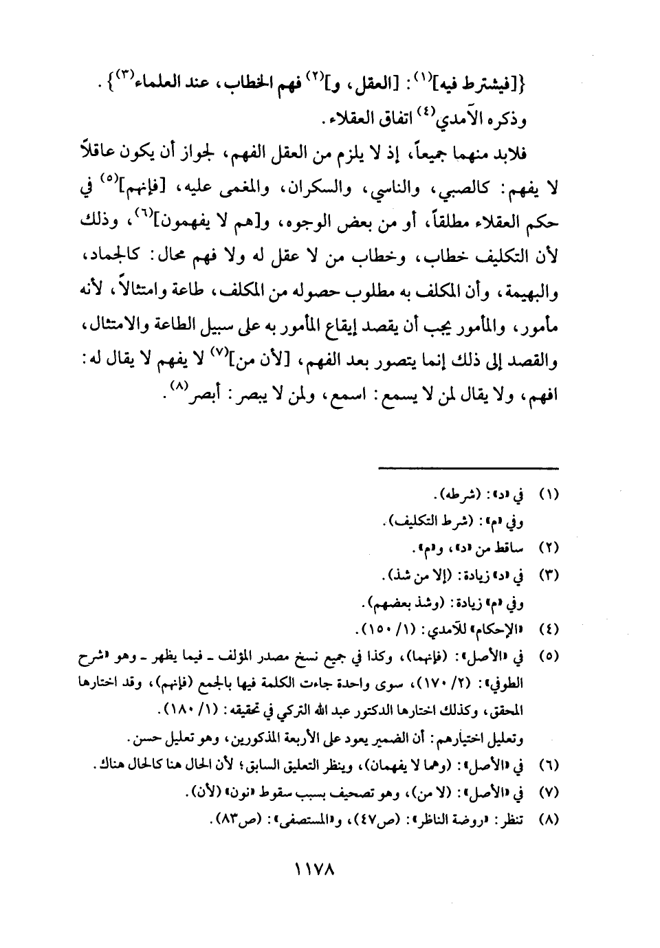 فَلَا بُد مِنْهُمَا جَمِيعًا، إِذْ لَا يلْزم من الْعقل الْفَهم، لجَوَاز أَن يكون عَاقِلا لَا يفهم: كَالصَّبِيِّ، وَالنَّاسِي، والسكران، والمغمى عَلَيْهِ، [فَإِنَّهُم] فِي حكم الْعُقَلَاء مُطلقًا، أَو من بعض الْوُجُوه، و [هم لَا يفهمون] ، وَذَلِكَ لِأَن التَّكْلِيف خطاب، وخطاب من لَا عقل لَهُ وَلَا فهم محَال: كالجماد، والبهيمة، وَأَن الْمُكَلف بِهِ مَطْلُوب حُصُوله من الْمُكَلف، طَاعَة وامتثالا، لِأَنَّهُ مَأْمُور، والمأمور يجب أَن يقْصد إِيقَاع الْمَأْمُور بِهِ على سَبِيل الطَّاعَة والامتثال، وَالْقَصْد إِلَى ذَلِك إِنَّمَا يتَصَوَّر بعد الْفَهم، [لِأَن من] لَا يفهم لَا يُقَال لَهُ: افهم، وَلَا يُقَال لمن لَا يسمع: اسْمَع، وَلمن لَا يبصر: أبْصر.