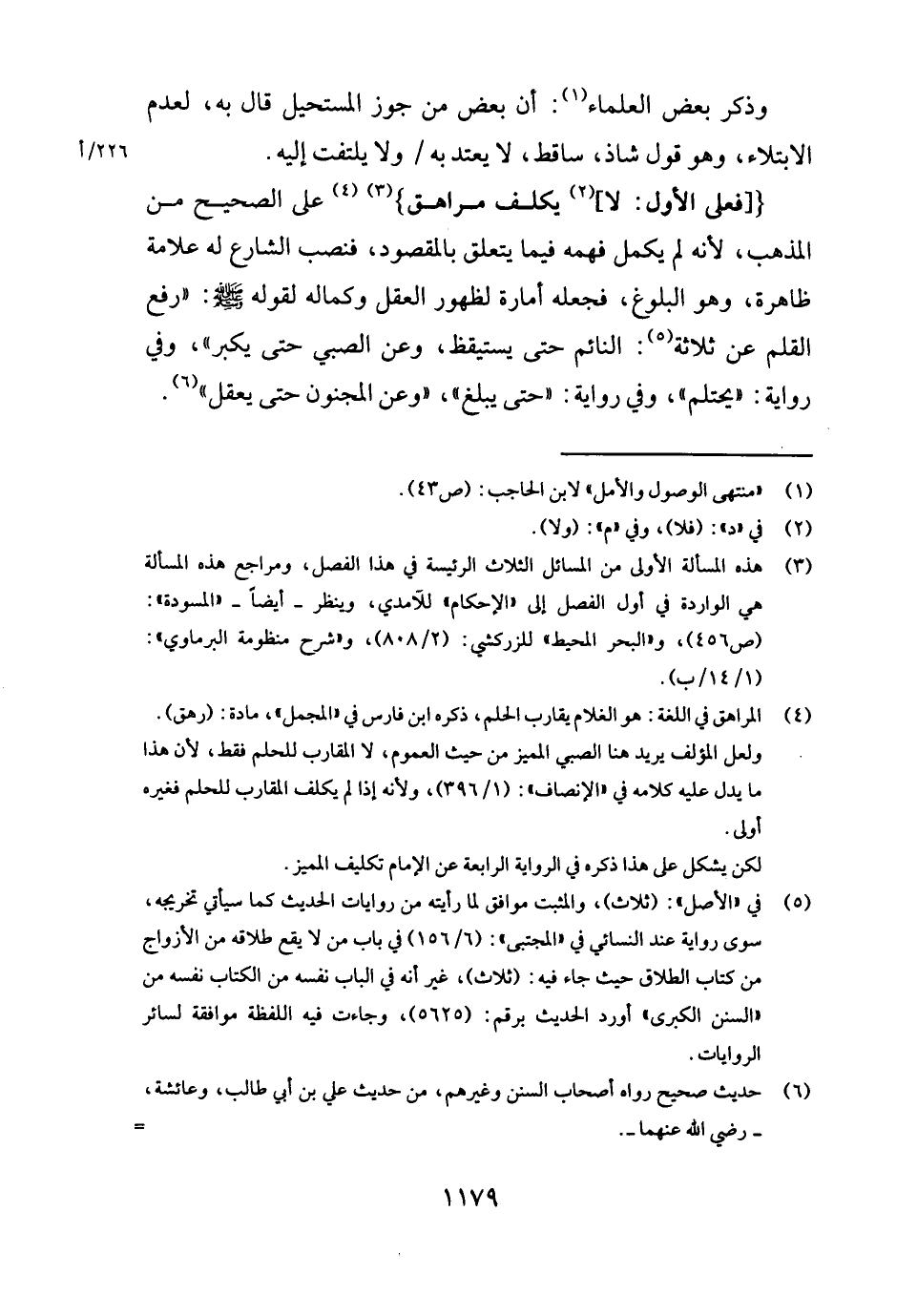 { [فعولى الأول: لَا] يُكَلف مراهق} على الصَّحِيح من الْمَذْهَب، لِأَنَّهُ لم يكمل فهمه فِيمَا يتَعَلَّق بِالْمَقْصُودِ، فنصب الشَّارِع لَهُ عَلامَة ظَاهِرَة، وَهُوَ الْبلُوغ، فَجعله أَمارَة لظُهُور الْعقل وكماله لقَوْله - صَلَّى اللَّهُ عَلَيْهِ وَسَلَّم َ -: " رفع الْقَلَم عَن ثَلَاثَة: النَّائِم حَتَّى يَسْتَيْقِظ، وَعَن الصَّبِي حَتَّى يكبر "، وَفِي رِوَايَة: " يَحْتَلِم "، وَفِي رِوَايَة: " حَتَّى يبلغ "، " وَعَن الْمَجْنُون حَتَّى يعقل ".