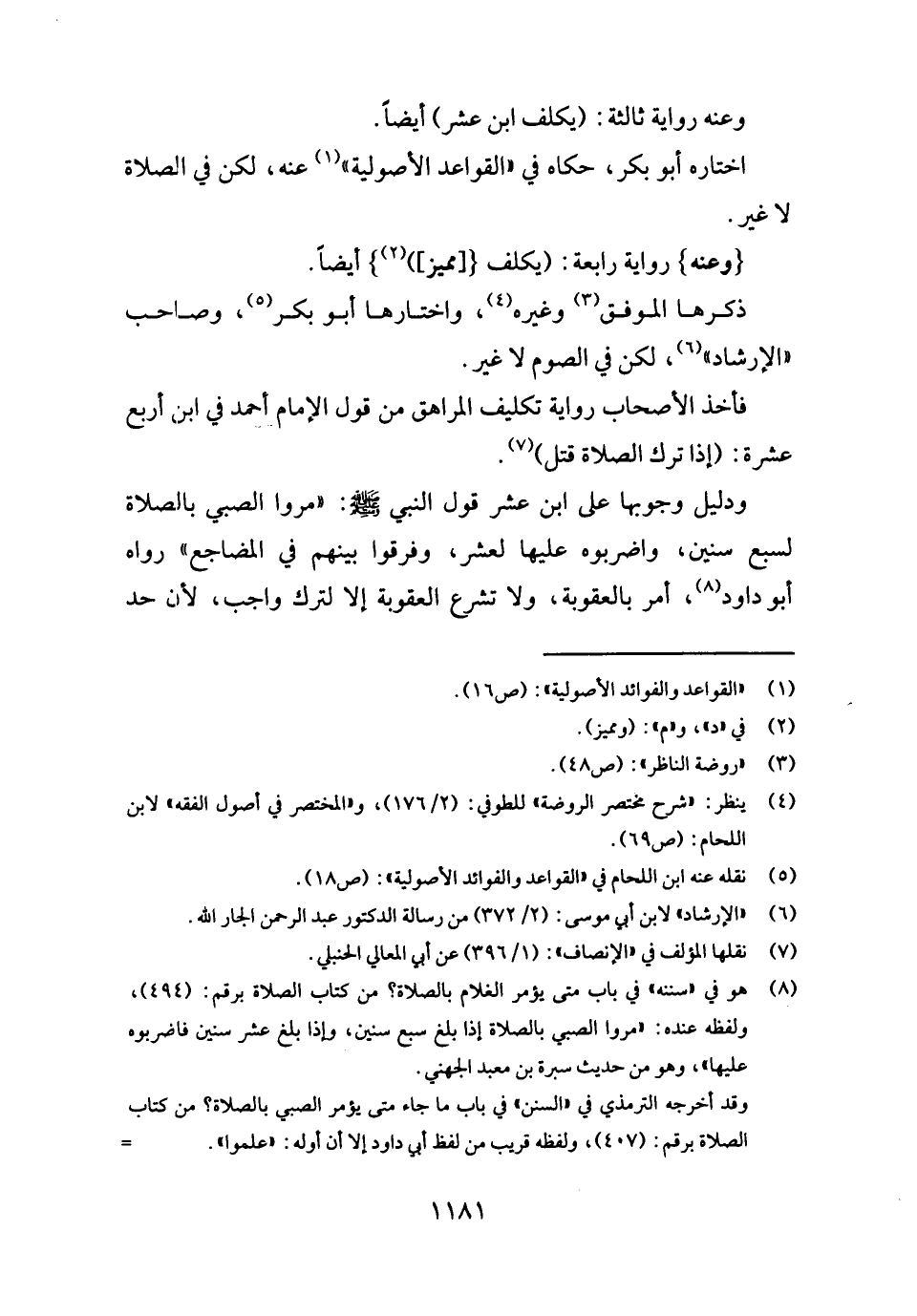 فَأخذ الْأَصْحَاب رِوَايَة تَكْلِيف الْمُرَاهق من قَول الإِمَام أَحْمد فِي ابْن أَربع عشرَة: (إِذا ترك الصَّلَاة قتل) .
