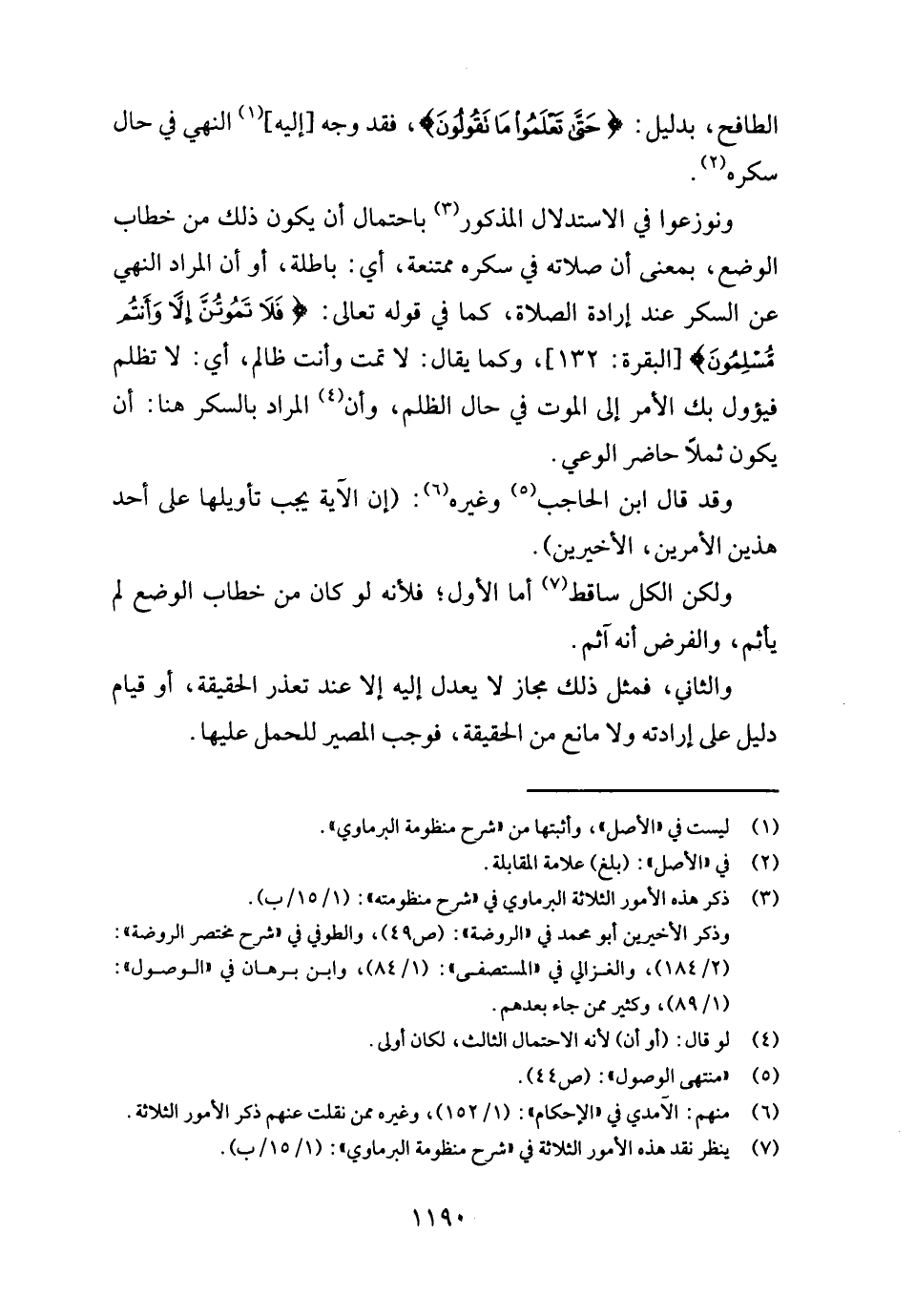 ونوزعوا فِي الِاسْتِدْلَال الْمَذْكُور بِاحْتِمَال أَن يكون ذَلِك من خطاب الْوَضع، بِمَعْنى أَن صلَاته فِي سكره ممتنعة، أَي: بَاطِلَة، أَو أَن المُرَاد النَّهْي عَن السكر عِنْد إِرَادَة الصَّلَاة، كَمَا فِي قَوْله تَعَالَى: {فَلَا تموتن إِلَّا وَأَنْتُم مُسلمُونَ} [الْبَقَرَة: ١٣٢] ، وكما يُقَال: لَا تمت وَأَنْتُم ظَالِم، أَي: لَا تظلم فيؤول بك الْأَمر إِلَى الْمَوْت فِي حَال الظُّلم، وَأَن المُرَاد بالسكر هُنَا: أَن يكون ثملا حَاضر الوعي.