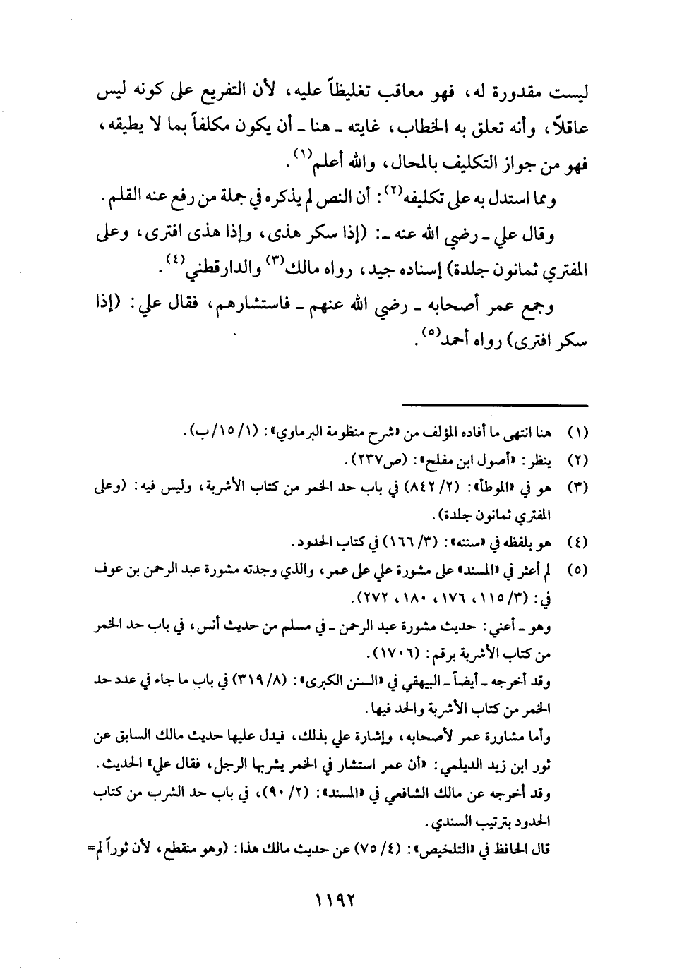 وَجمع عمر أَصْحَابه - رَضِي الله عَنْهُم - فاستشارهم، فَقَالَ عَليّ: (إِذا سكر افترى) رَوَاهُ أَحْمد.