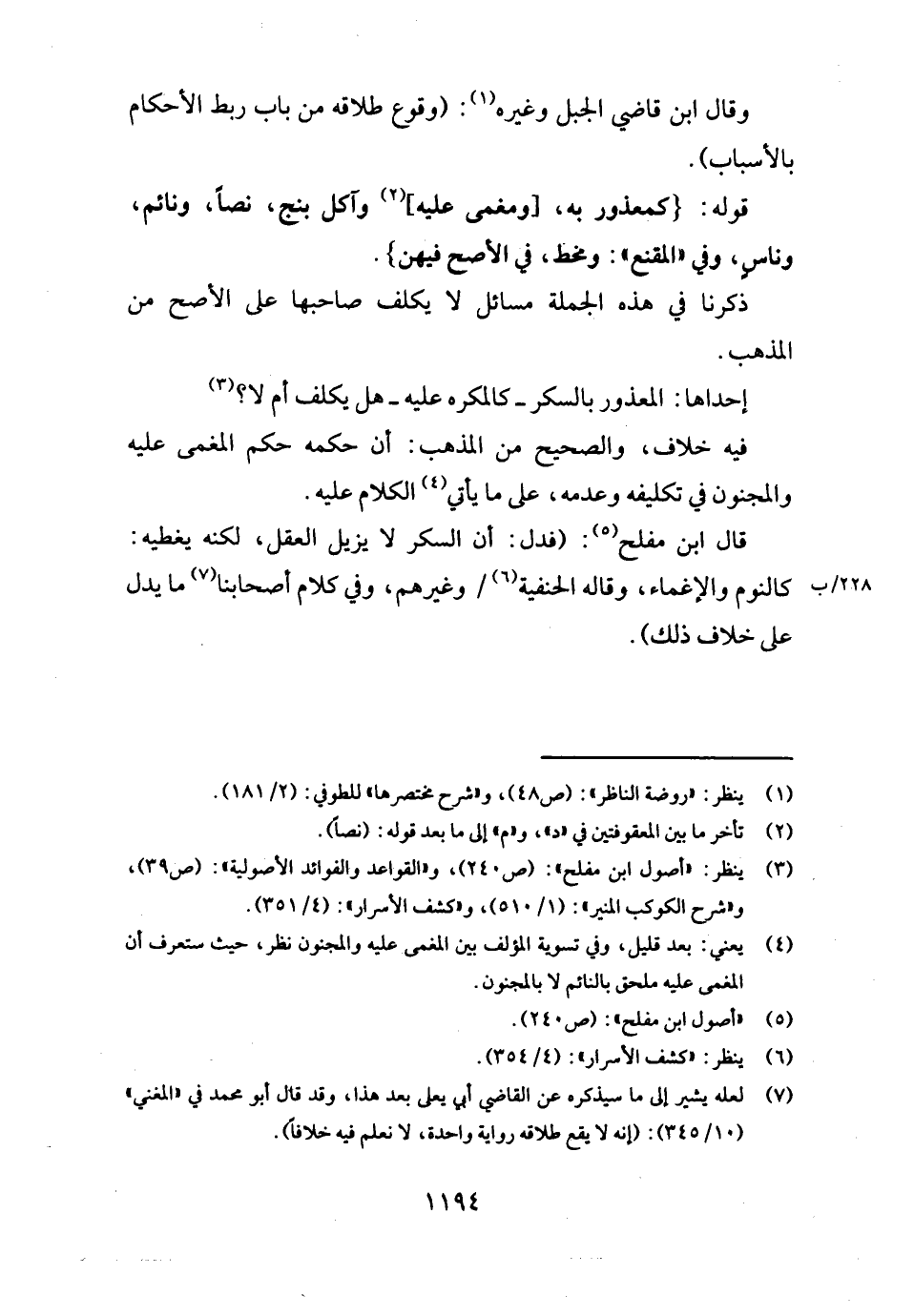 قَالَ ابْن مُفْلِح: (فَدلَّ: أَن السكر لَا يزِيل الْعقل، لكنه يغطيه: كالنوم وَالْإِغْمَاء، وَقَالَهُ الْحَنَفِيَّة وَغَيرهم، وَفِي كَلَام أَصْحَابنَا مَا يدل على خلاف ذَلِك) .