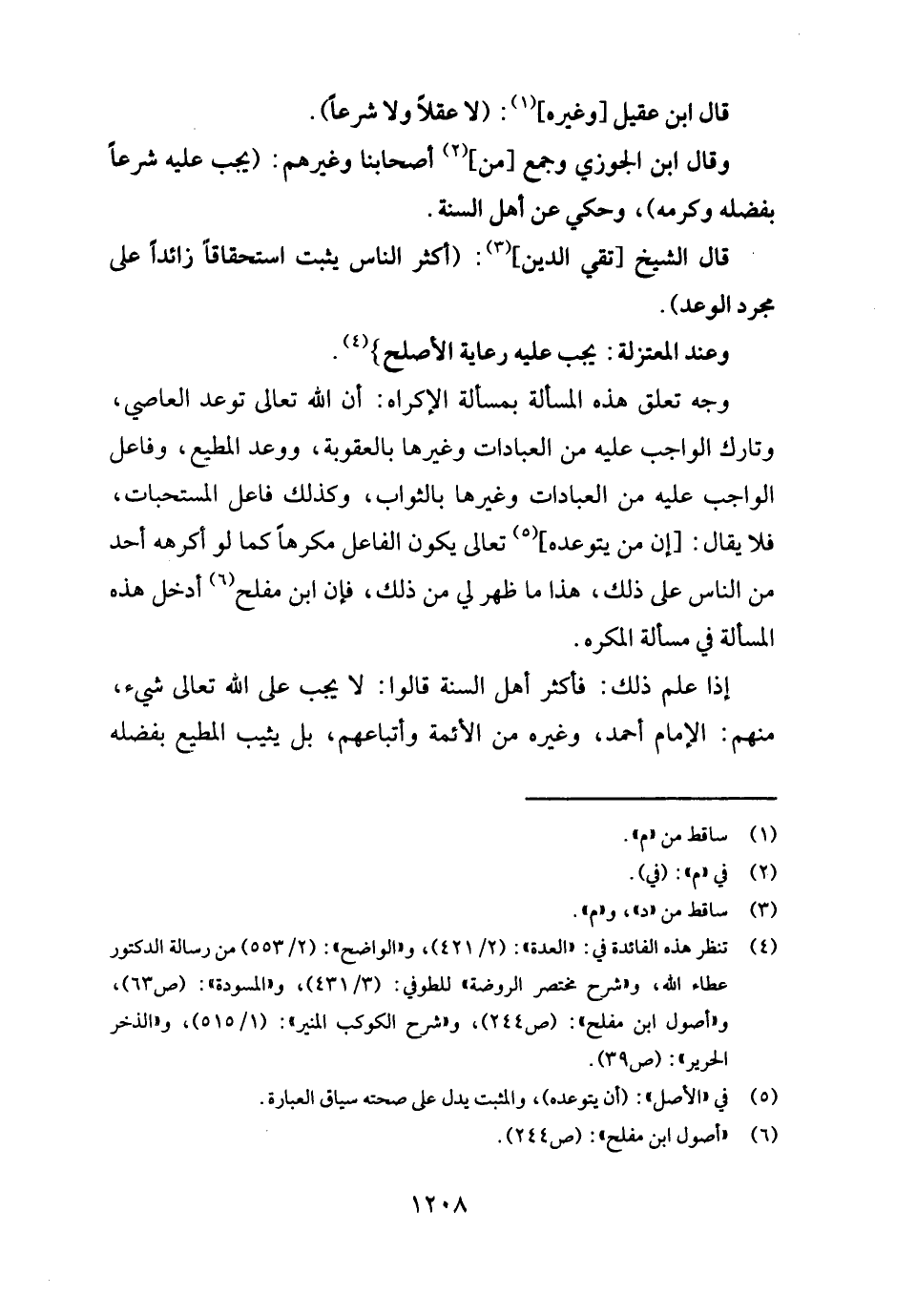 إِذا علم ذَلِك: فَأكْثر أهل السّنة قَالُوا: لَا يجب على الله تَعَالَى شَيْء، مِنْهُم: الإِمَام أَحْمد، وَغَيره من الْأَئِمَّة وأتباعهم، بل يثيب الْمُطِيع بفضله