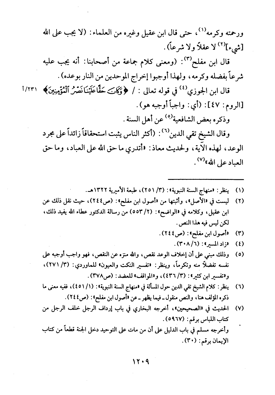 قَالَ ابْن مُفْلِح: (وَمعنى كَلَام جمَاعَة من أَصْحَابنَا: أَنه يجب عَلَيْهِ شرعا بفضله وَكَرمه، وَلِهَذَا أوجبوا إِخْرَاج الْمُوَحِّدين من النَّار بوعده) .