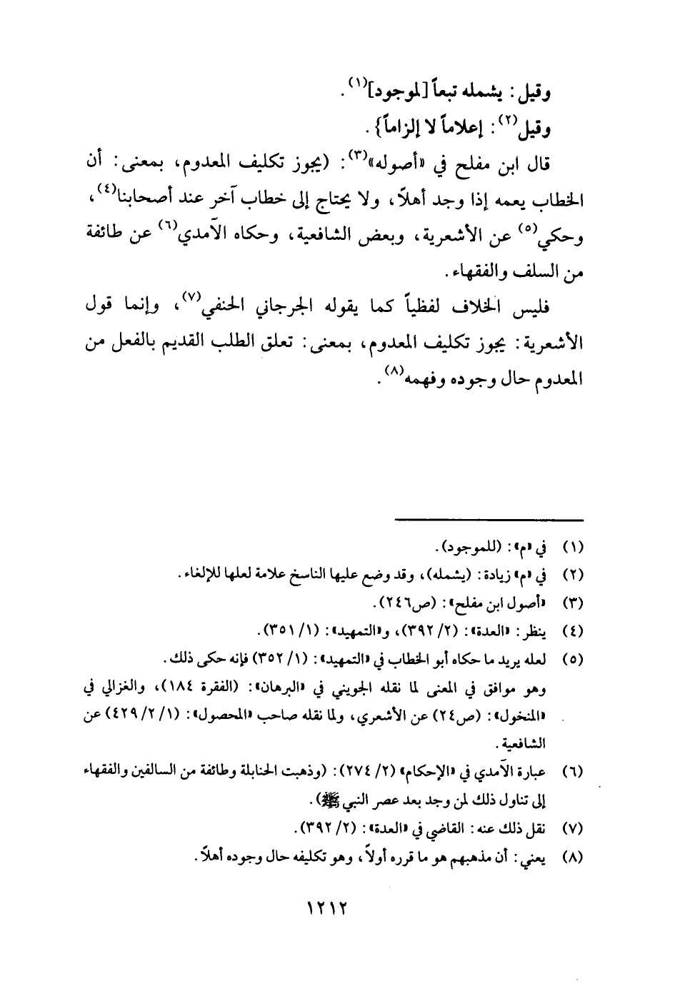 قَالَ ابْن مُفْلِح فِي " أُصُوله ": (يجوز تَكْلِيف الْمَعْدُوم، بِمَعْنى: أَن الْخطاب يعمه إِذا وجد أَهلا، وَلَا يحْتَاج إِلَى خطاب آخر عِنْد أَصْحَابنَا، وَحكي عَن الأشعرية، وَبَعض الشَّافِعِيَّة، وَحَكَاهُ الْآمِدِيّ عَن طَائِفَة من السّلف وَالْفُقَهَاء.
