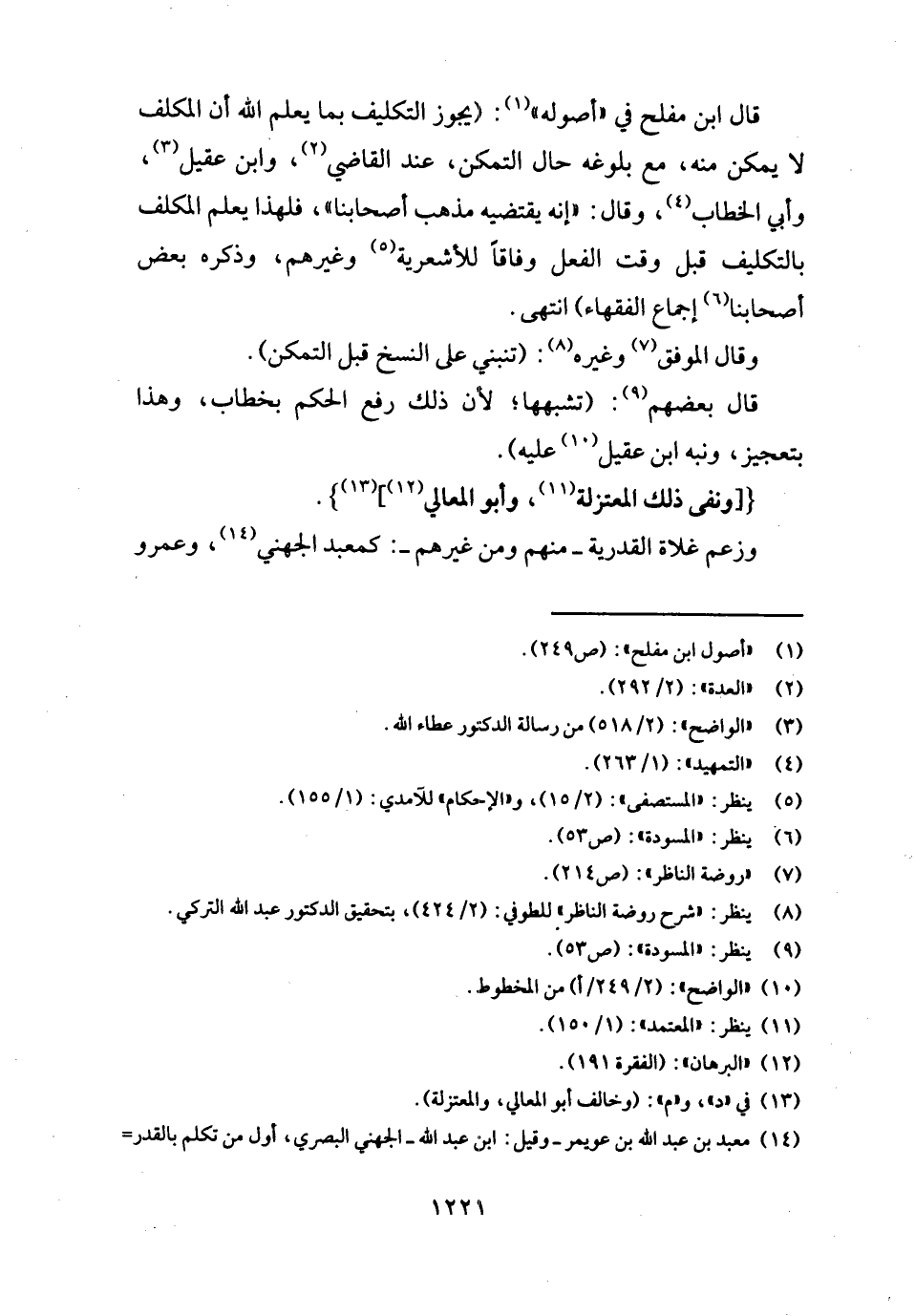 قَالَ ابْن مُفْلِح فِي " أُصُوله ": (يجوز التَّكْلِيف بِمَا يعلم الله أَن الْمُكَلف لَا يُمكن مِنْهُ، مَعَ بُلُوغه حَال التَّمَكُّن، عِنْد القَاضِي، وَابْن عقيل، وَأبي الْخطاب، وَقَالَ: " إِنَّه يَقْتَضِيهِ مَذْهَب أَصْحَابنَا "، فَلهَذَا يعلم الْمُكَلف بالتكليف قبل وَقت الْفِعْل وفَاقا للأشعرية وَغَيرهم، وَذكره بعض أَصْحَابنَا إِجْمَاع الْفُقَهَاء) انْتهى.