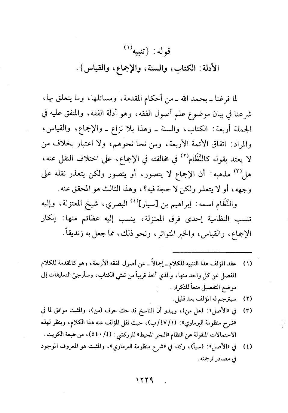 لما فَرغْنَا - بِحَمْد الله - من أَحْكَام الْمُقدمَة، ومسائلها، وَمَا يتَعَلَّق بهَا، شرعنا فِي بَيَان مَوْضُوع علم أصُول الْفِقْه، وَهُوَ أَدِلَّة الْفِقْه، والمتفق عَلَيْهِ فِي الْجُمْلَة أَرْبَعَة: الْكتاب، وَالسّنة - وَهَذَا بِلَا نزاع - وَالْإِجْمَاع، وَالْقِيَاس، وَالْمرَاد: اتِّفَاق الْأَئِمَّة الْأَرْبَعَة، وَمن نحا نحوهم، وَلَا اعْتِبَار بِخِلَاف من لَا يعْتد بقوله كالنظام فِي مُخَالفَته فِي الْإِجْمَاع، على اخْتِلَاف النَّقْل عَنهُ، هَل مذْهبه: أَن الْإِجْمَاع لَا يتَصَوَّر، أَو يتَصَوَّر وَلَكِن يتَعَذَّر نَقله على وَجهه، أَو لَا يتَعَذَّر وَلَكِن لَا حجَّة فِيهِ؟ ، وَهَذَا الثَّالِث هُوَ الْمُحَقق عَنهُ.
