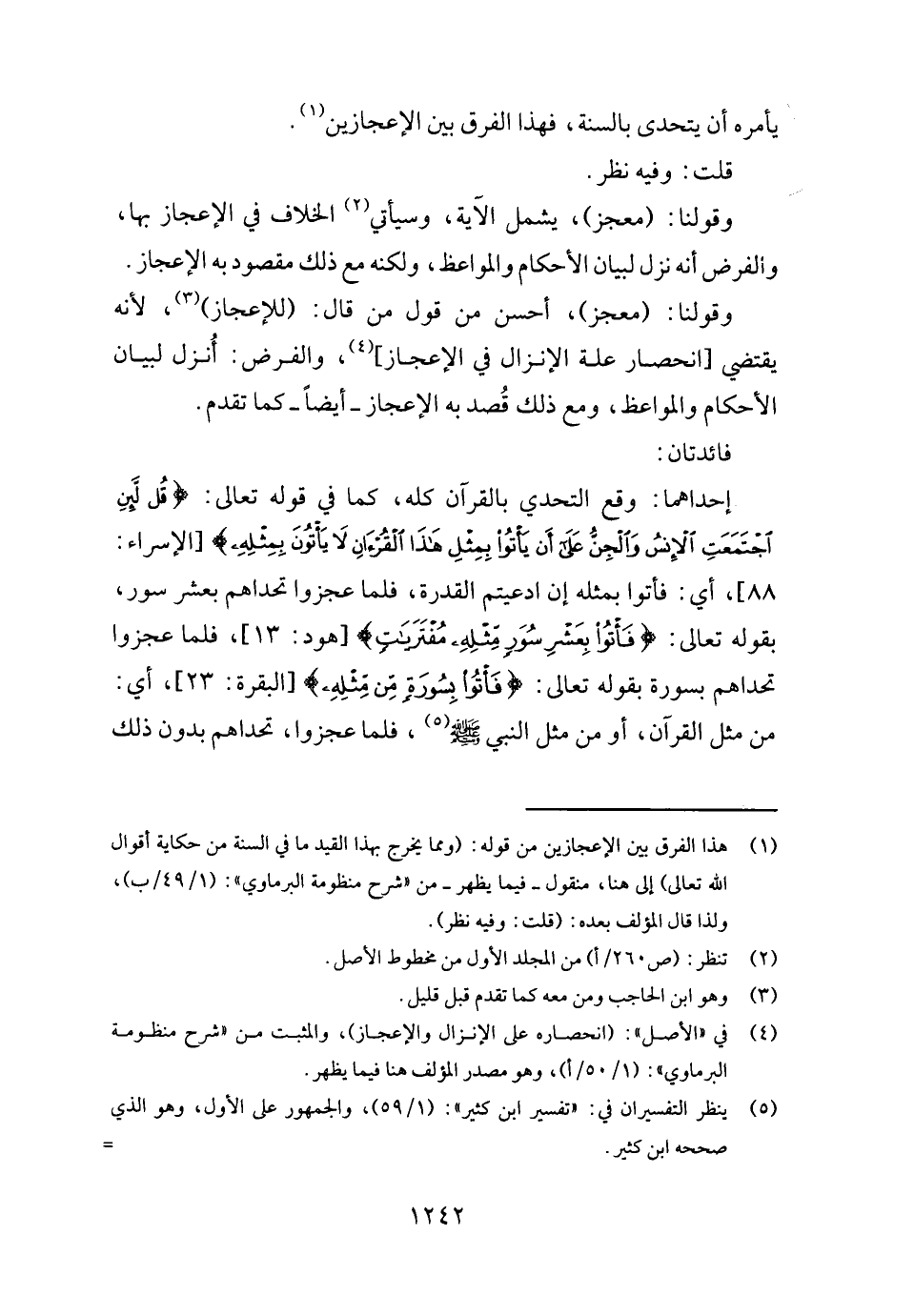 وَقَوْلنَا: (معجز) ، أحسن من قَول من قَالَ: (للإعجاز) ، لِأَنَّهُ يَقْتَضِي [انحصار عِلّة الْإِنْزَال فِي الإعجاز] ، وَالْفَرْض: أنزل لبَيَان الْأَحْكَام والمواعظ، وَمَعَ ذَلِك قصد بِهِ الإعجاز - أَيْضا - كَمَا تقدم.