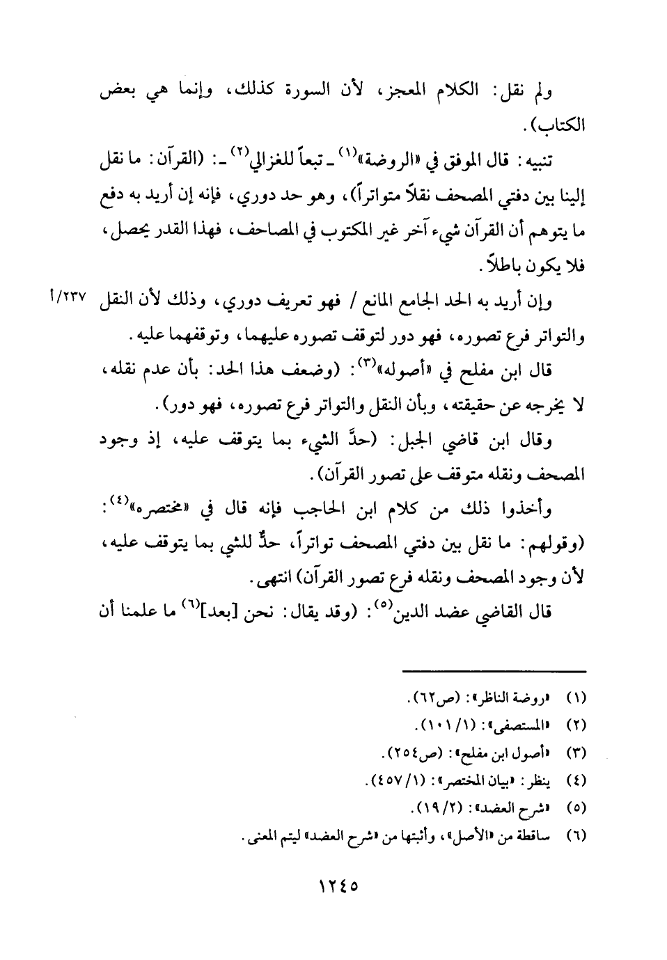 تَنْبِيه: قَالَ الْمُوفق فِي " الرَّوْضَة " - تبعا للغزالي -: (الْقُرْآن: مَا نقل إِلَيْنَا بَين دفتي الْمُصحف نقلا متواترا) ، وَهُوَ حد دوري، فَإِنَّهُ إِن أُرِيد بِهِ دفع مَا يتَوَهَّم أَن الْقُرْآن شَيْء آخر غير الْمَكْتُوب فِي الْمَصَاحِف، فَهَذَا الْقدر يحصل، فَلَا يكون بَاطِلا.