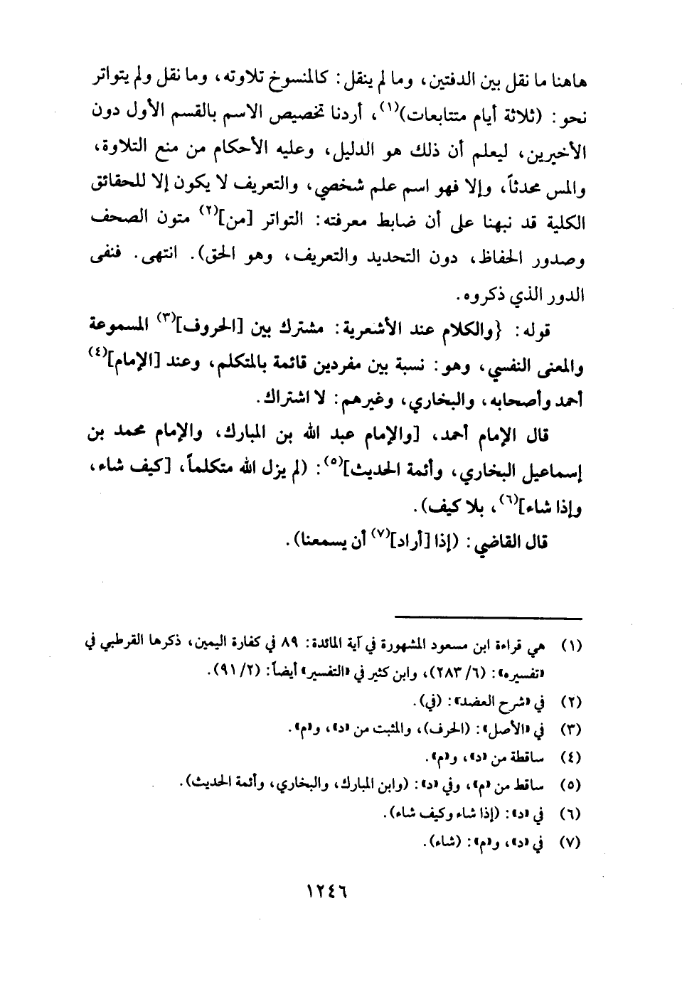 قَالَ الإِمَام أَحْمد: [وَالْإِمَام عبد الله بن الْمُبَارك، وَالْإِمَام مُحَمَّد بن إِسْمَاعِيل البُخَارِيّ، وأئمة الحَدِيث] : (لم يزل الله متكلما، [كَيفَ شَاءَ، وَإِذا شَاءَ] ، بِلَا كَيفَ) .