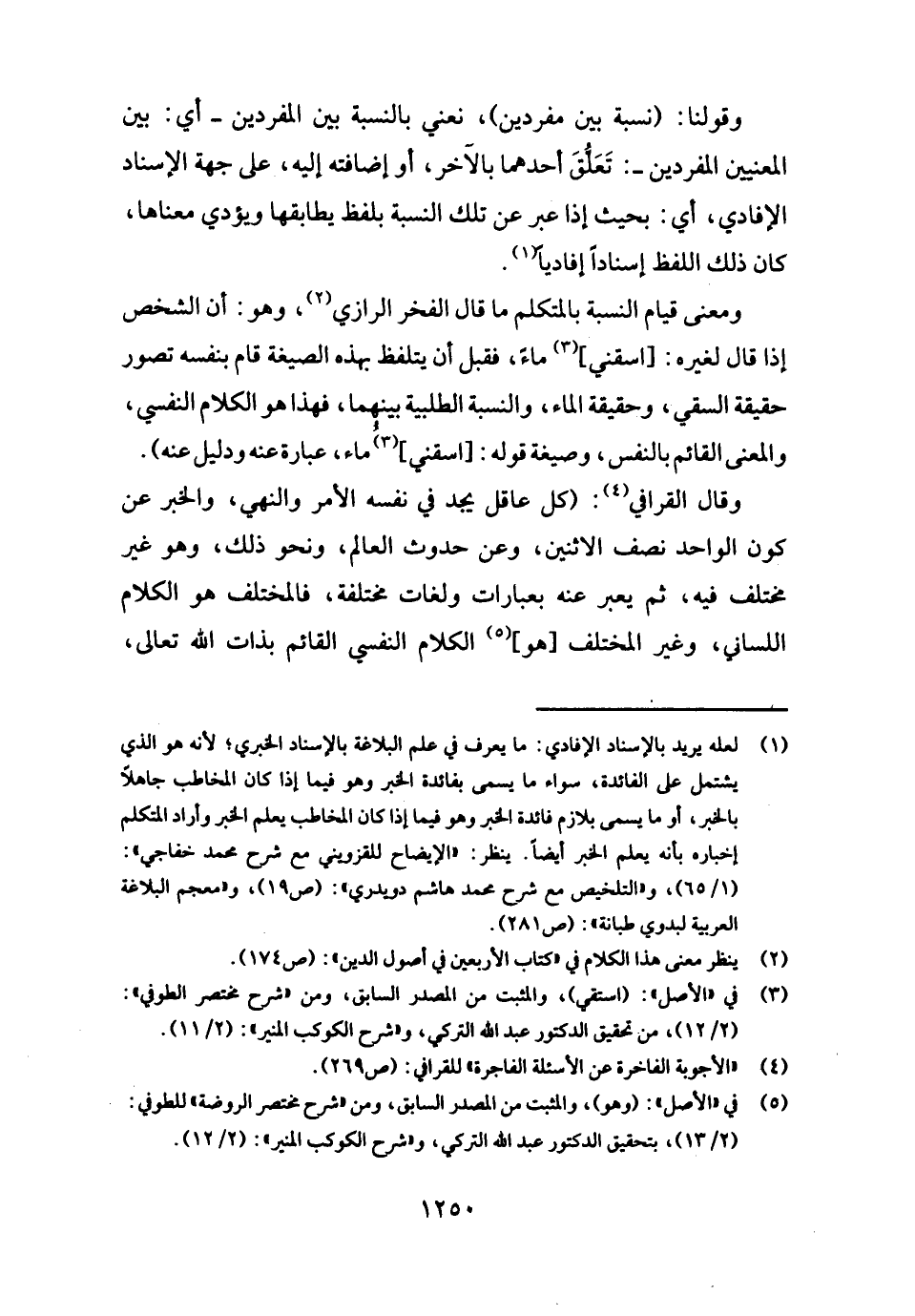 وَمعنى قيام النِّسْبَة بالمتكلم مَا قَالَ الْفَخر الرَّازِيّ، وَهُوَ: أَن الشَّخْص إِذا قَالَ لغيره: [اسْقِنِي] مَاء، فَقبل أَن يتَلَفَّظ بِهَذِهِ الصِّيغَة قَامَ بِنَفسِهِ تصور حَقِيقَة السَّقْي، وَحَقِيقَة المَاء، وَالنِّسْبَة الطلبية بَينهمَا، فَهَذَا هُوَ الْكَلَام النَّفْسِيّ، وَالْمعْنَى الْقَائِم بِالنَّفسِ، وَصِيغَة قَوْله: [اسْقِنِي] مَاء، عبارَة عَنهُ وَدَلِيل عَنهُ) .