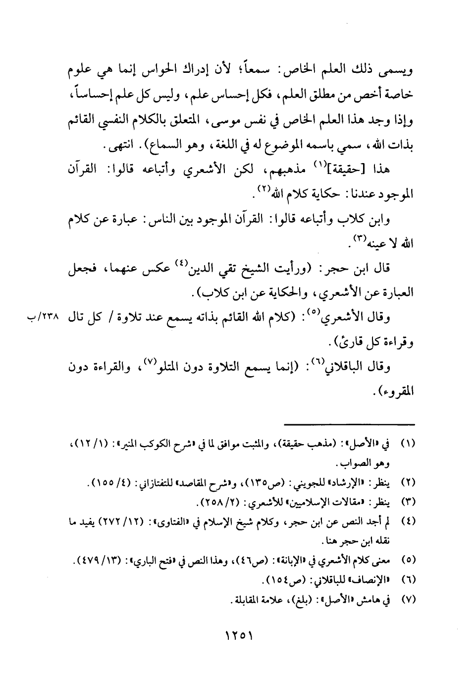 وَابْن كلاب وَأَتْبَاعه قَالُوا: الْقُرْآن الْمَوْجُود بَين النَّاس: عبارَة عَن كَلَام الله لَا عينه.