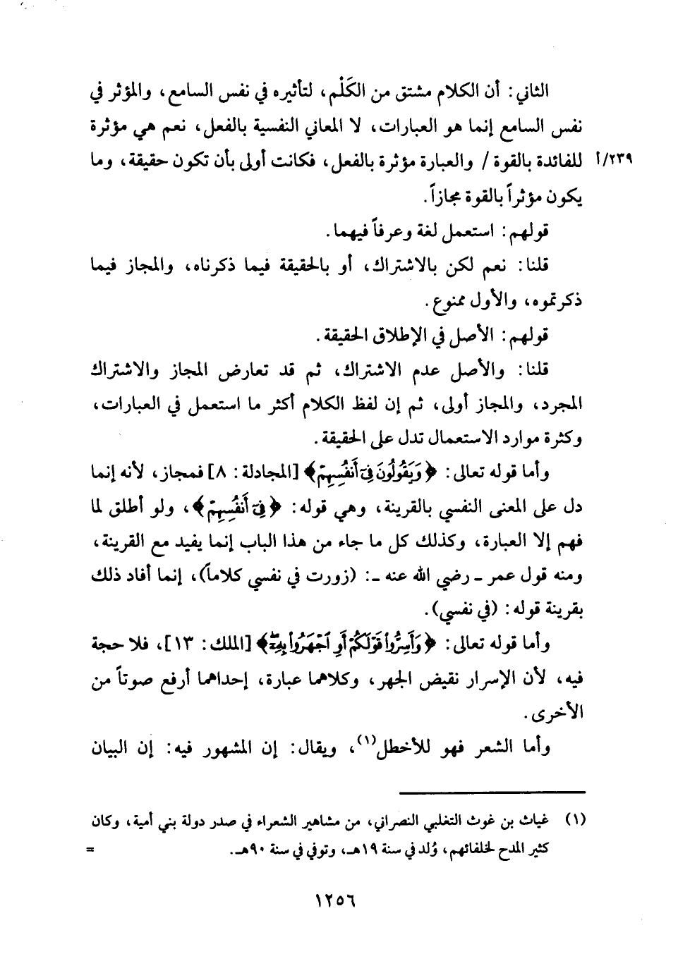 وَأما قَوْله تَعَالَى: {وَيَقُولُونَ فِي أنفسهم} [المجادلة: ٨] فمجاز، لِأَنَّهُ إِنَّمَا دلّ على الْمَعْنى النَّفْسِيّ بِالْقَرِينَةِ، وَهِي قَوْله: {فِي أنفسهم} ، وَلَو أطلق لما فهم إِلَّا الْعبارَة، وَكَذَلِكَ كل مَا جَاءَ من هَذَا الْبَاب إِنَّمَا يُفِيد مَعَ الْقَرِينَة، وَمِنْه قَول عمر - رَضِي الله عَنهُ -: (زورت فِي نَفسِي كلَاما) ، إِنَّمَا أَفَادَ ذَلِك بِقَرِينَة قَوْله: (فِي نَفسِي) .
