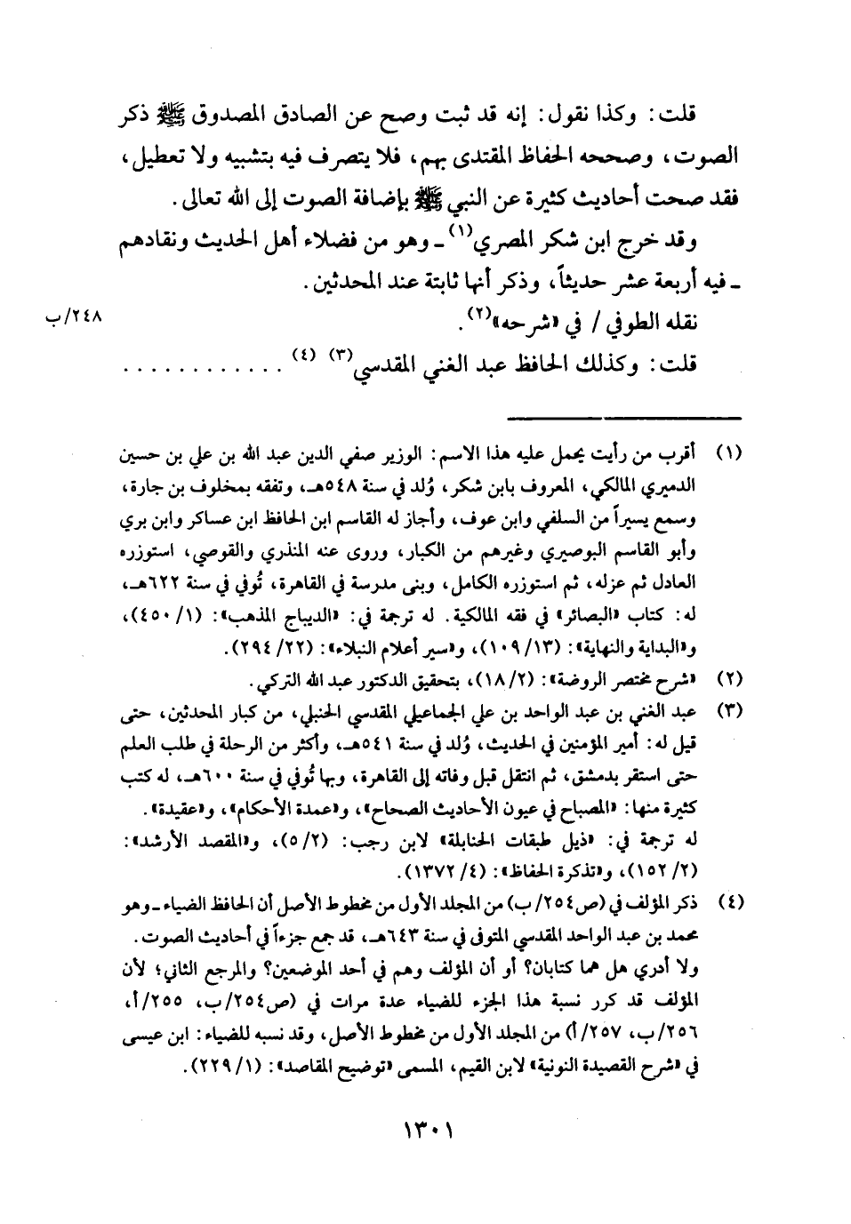 قلت: وَكَذَا نقُول: إِنَّه قد ثَبت وَصَحَّ عَن الصَّادِق المصدوق - صَلَّى اللَّهُ عَلَيْهِ وَسَلَّم َ - ذكر الصَّوْت، وَصَححهُ الْحفاظ المقتدى بهم، فَلَا يتَصَرَّف فِيهِ بتشبيه وَلَا تَعْطِيل، فقد صحت أَحَادِيث كَثِيرَة عَن النَّبِي - صَلَّى اللَّهُ عَلَيْهِ وَسَلَّم َ - بِإِضَافَة الصَّوْت إِلَى الله تَعَالَى.