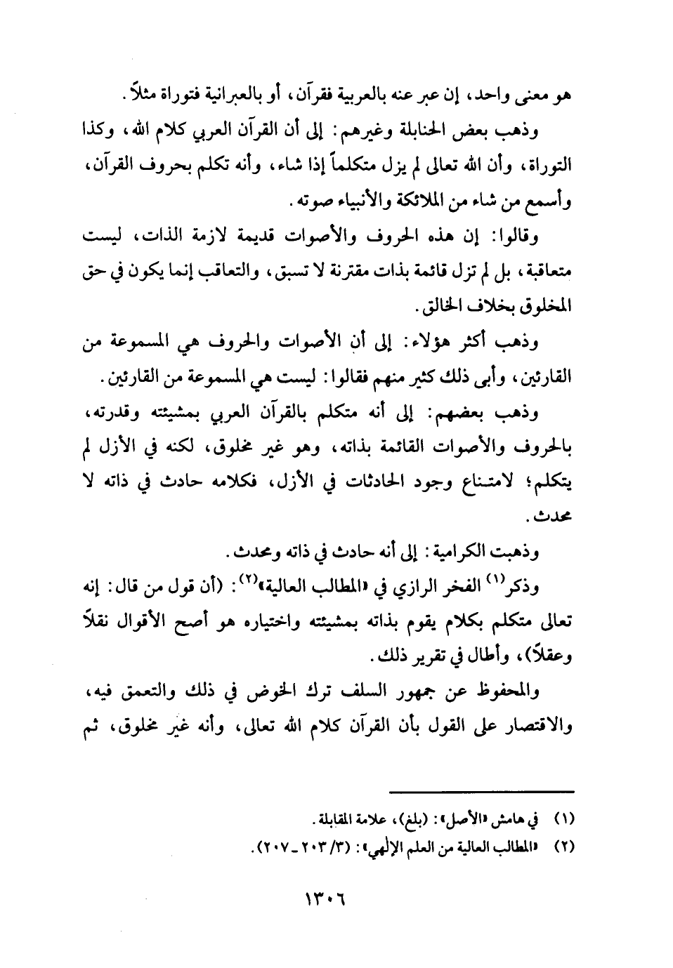 وَذكر الْفَخر الرَّازِيّ فِي " المطالب الْعَالِيَة ": (أَن قَول من قَالَ: إِنَّه تَعَالَى مُتَكَلم بِكَلَام يقوم بِذَاتِهِ بمشيئته واختياره هُوَ أصح الْأَقْوَال نقلا وعقلا) ، وَأطَال فِي تَقْرِير ذَلِك.