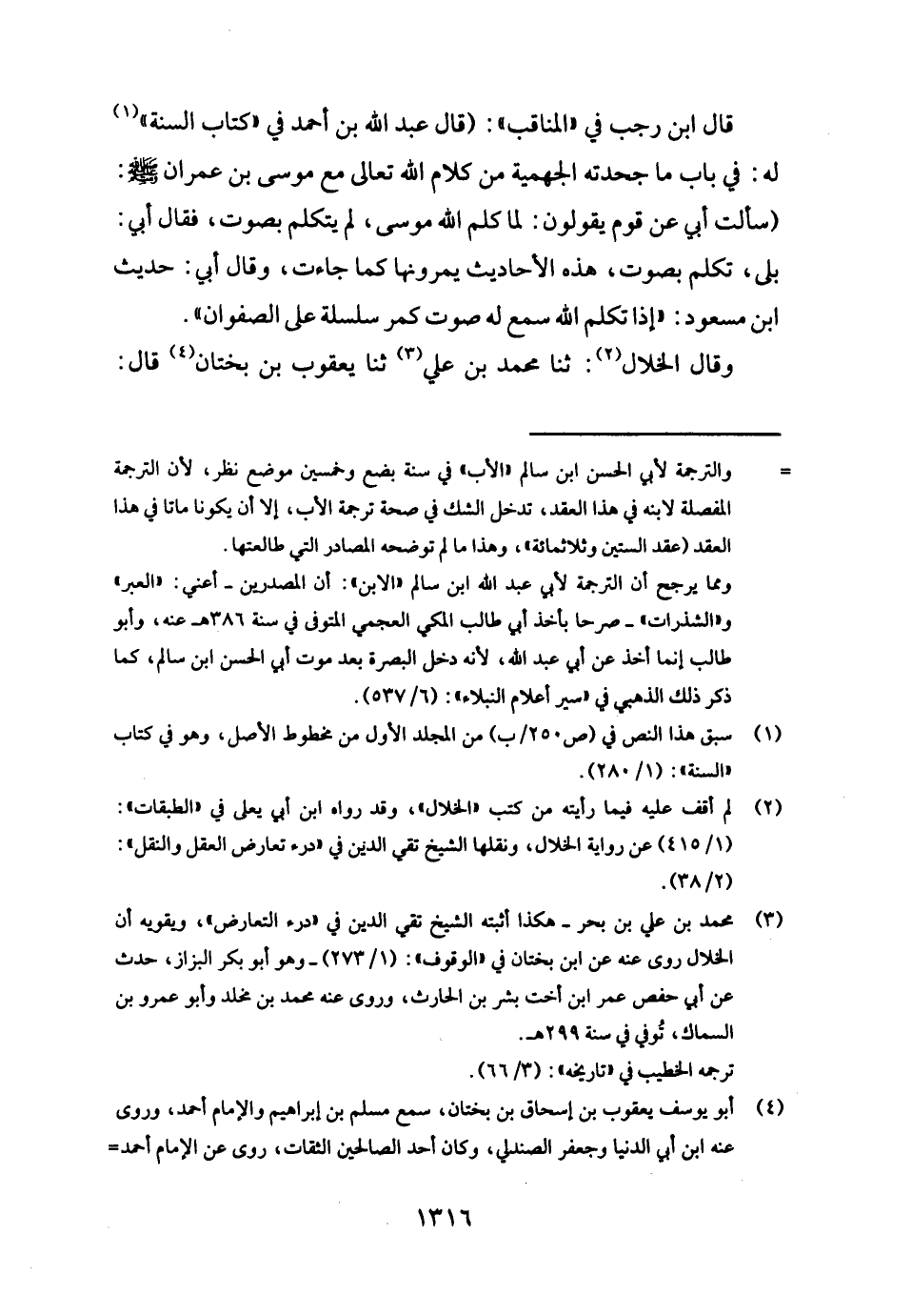 قَالَ ابْن رَجَب فِي " المناقب ": (قَالَ عبد الله بن أَحْمد فِي " كتاب السّنة " لَهُ: فِي بَاب مَا جحدته الْجَهْمِية من كَلَام الله تَعَالَى مَعَ مُوسَى بن عمرَان - صَلَّى اللَّهُ عَلَيْهِ وَسَلَّم َ -: (سَأَلت أبي عَن قوم يَقُولُونَ: لما كلم الله مُوسَى، لم يتَكَلَّم بِصَوْت، فَقَالَ أبي: بلَى، تكلم بِصَوْت، هَذِه الْأَحَادِيث يمرونها كَمَا جَاءَت، وَقَالَ أبي: حَدِيث ابْن مَسْعُود: " إِذا تكلم الله سمع لَهُ صَوت كمر سلسلة على الصفوان ".