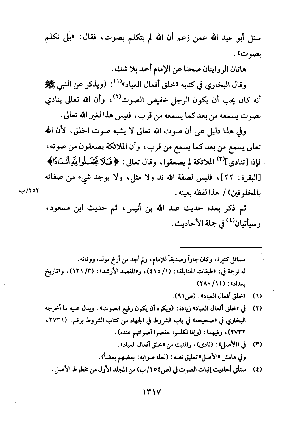 وَفِي هَذَا دَلِيل على أَن صَوت الله تَعَالَى لَا يشبه صَوت الْخلق، لِأَن الله تَعَالَى يسمع من بعد كَمَا يسمع من قرب، وَأَن الْمَلَائِكَة يصعقون من صَوته، فَإِذا [تنادى] الْمَلَائِكَة لم يصعقوا، وَقَالَ تَعَالَى: {فَلَا تجْعَلُوا لله أندادا} [الْبَقَرَة: ٢٢] ، فَلَيْسَ لصفة الله ند وَلَا مثل، وَلَا يُوجد شَيْء من صِفَاته بالمخلوقين) هَذَا لَفظه بِعَيْنِه.