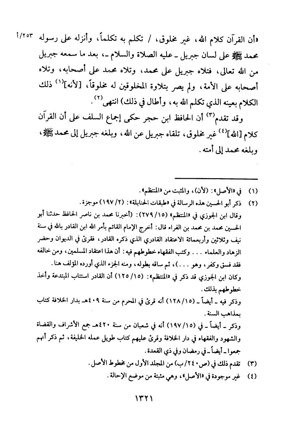 وَقد تقدم أَن الْحَافِظ ابْن حجر حكى إِجْمَاع السّلف على أَن الْقُرْآن كَلَام [الله] غير مَخْلُوق، تَلقاهُ جِبْرِيل عَن الله، وبلغه جِبْرِيل إِلَى مُحَمَّد - صَلَّى اللَّهُ عَلَيْهِ وَسَلَّم َ -، وبلغه مُحَمَّد إِلَى أمته.