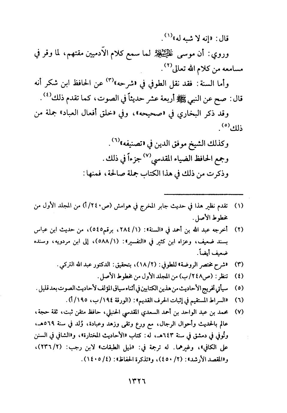 وَأما السّنة: فقد نقل الطوفي فِي " شَرحه " عَن الْحَافِظ ابْن شكر أَنه قَالَ: صَحَّ عَن النَّبِي - صَلَّى اللَّهُ عَلَيْهِ وَسَلَّم َ - أَرْبَعَة عشر حَدِيثا فِي الصَّوْت، كَمَا تقدم ذَلِك.