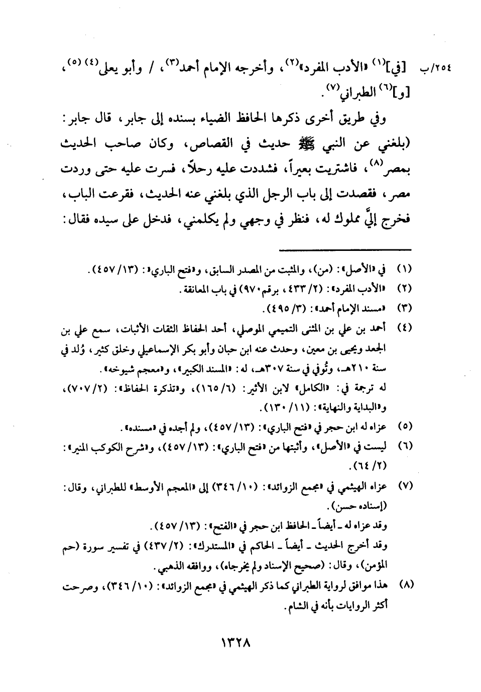 وَفِي طَرِيق أُخْرَى ذكرهَا الْحَافِظ الضياء بِسَنَدِهِ إِلَى جَابر، قَالَ جَابر: (بَلغنِي عَن النَّبِي - صَلَّى اللَّهُ عَلَيْهِ وَسَلَّم َ - حَدِيث فِي الْقصاص، وَكَانَ صَاحب الحَدِيث بِمصْر، فاشتريت بَعِيرًا، فشددت عَلَيْهِ رحلا، فسرت عَلَيْهِ حَتَّى وَردت مصر، فقصدت إِلَى بَاب الرجل الَّذِي بَلغنِي عَنهُ الحَدِيث، فقرعت الْبَاب، فَخرج إِلَيّ مَمْلُوك لَهُ، فَنظر فِي وَجْهي وَلم يكلمني، فَدخل على سَيّده فَقَالَ: