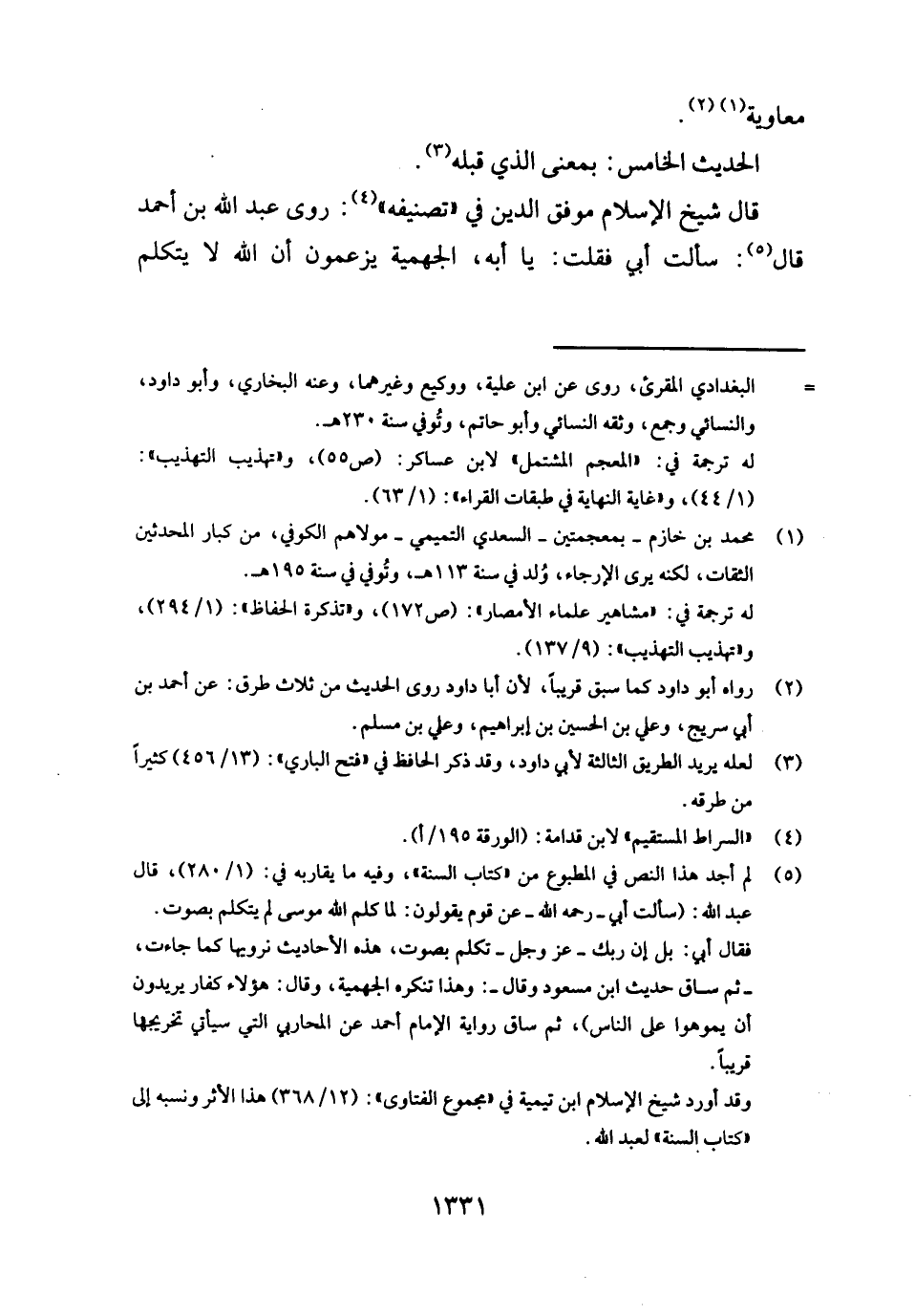 قَالَ شيخ الْإِسْلَام موفق الدّين فِي " تصنيفه ": روى عبد الله بن أَحْمد قَالَ: سَأَلت أبي فَقلت: يَا أبه، الْجَهْمِية يَزْعمُونَ أَن الله لَا يتَكَلَّم