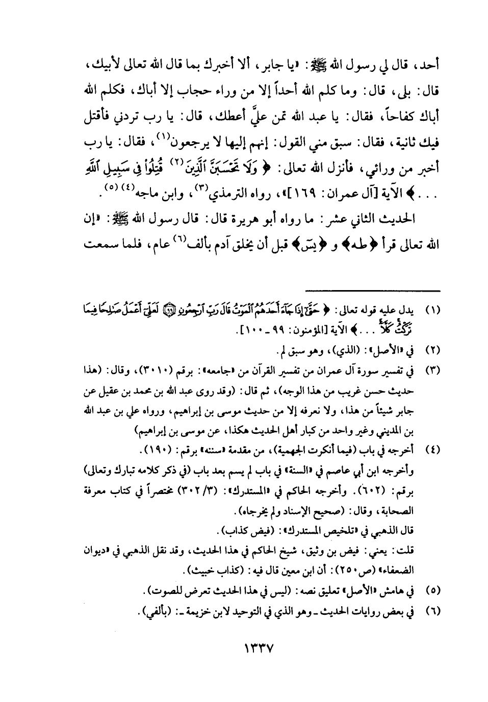 أحد، قَالَ لي رَسُول الله - صَلَّى اللَّهُ عَلَيْهِ وَسَلَّم َ -: " يَا جَابر، أَلا أخْبرك بِمَا قَالَ الله تَعَالَى لأَبِيك، قَالَ: بلَى، قَالَ: وَمَا كلم الله أحدا إِلَّا من وَرَاء حجاب إِلَّا أَبَاك، فَكلم الله أَبَاك كفاحا، فَقَالَ: يَا عبد الله تمن عَليّ أعطك، قَالَ: يَا رب تردني فأقتل فِيك ثَانِيَة، فَقَالَ: سبق مني القَوْل: إِنَّهُم إِلَيْهَا لَا يرجعُونَ، فَقَالَ: يَا رب أخبر من ورائي، فَأنْزل الله تَعَالَى: {وَلَا تحسبن الَّذين قتلوا فِي سَبِيل الله} الْآيَة [آل عمرَان: ١٦٩] " رَوَاهُ التِّرْمِذِيّ، وَابْن ماجة.