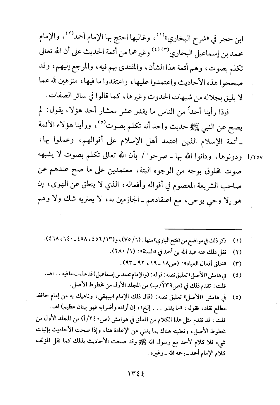 فَإِذا رَأينَا أحدا من النَّاس مَا يقدر عشر معشار أحد هَؤُلَاءِ يَقُول: لم يَصح عَن النَّبِي - صَلَّى اللَّهُ عَلَيْهِ وَسَلَّم َ - حَدِيث وَاحِد أَنه تكلم بِصَوْت، ورأينا هَؤُلَاءِ الْأَئِمَّة - أَئِمَّة الْإِسْلَام الَّذين اعْتمد أهل الْإِسْلَام على أَقْوَالهم، وَعمِلُوا بهَا، ودونوها، ودانوا الله بهَا - صَرَّحُوا بِأَن الله تَعَالَى تكلم بِصَوْت لَا يُشبههُ صَوت مَخْلُوق بِوَجْه من الْوُجُوه الْبَتَّةَ، معتمدين على مَا صَحَّ عِنْدهم عَن صَاحب الشَّرِيعَة الْمَعْصُوم فِي أَقْوَاله وأفعاله، الَّذِي لَا ينْطق عَن الْهوى، إِن هُوَ إِلَّا وَحي يُوحى، مَعَ اعْتِقَادهم - الجازمين بِهِ، لَا يَعْتَرِيه شكّ وَلَا وهم