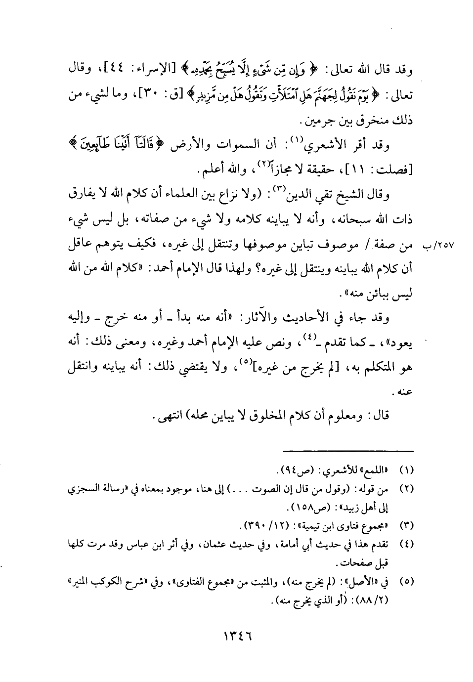 وَقَالَ الشَّيْخ تَقِيّ الدّين: (وَلَا نزاع بَين الْعلمَاء أَن كَلَام الله لَا يُفَارق ذَات الله سُبْحَانَهُ، وَأَنه لَا يباينه كَلَامه وَلَا شَيْء من صِفَاته، بل لَيْسَ شَيْء من صفة مَوْصُوف تبَاين موصوفها وتنتقل إِلَى غَيره، فَكيف يتَوَهَّم عَاقل أَن كَلَام الله يباينه وينتقل إِلَى غَيره؟ وَلِهَذَا قَالَ الإِمَام أَحْمد: " كَلَام الله من الله لَيْسَ ببائن مِنْهُ ".