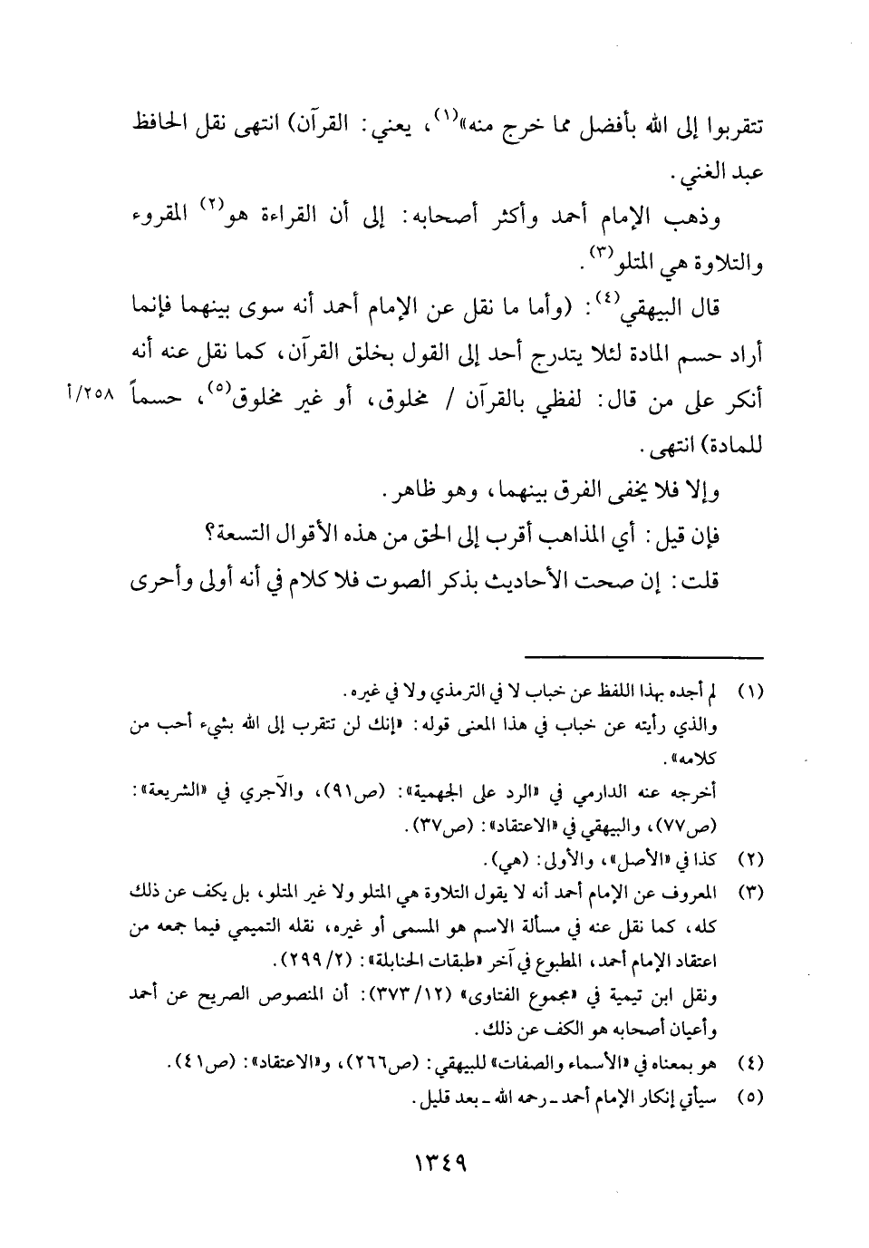 قَالَ الْبَيْهَقِيّ: (وَأما مَا نقل عَن الإِمَام أَحْمد أَنه سوى بَينهمَا فَإِنَّمَا أَرَادَ حسم الْمَادَّة لِئَلَّا يتدرج أحد إِلَى القَوْل بِخلق الْقُرْآن، كَمَا نقل عَنهُ أَنه أنكر على من قَالَ: لَفْظِي بِالْقُرْآنِ مَخْلُوق، أَو غير مَخْلُوق، حسما للمادة) انْتهى.