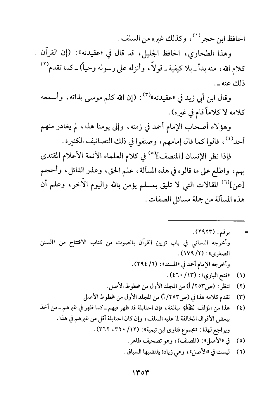 فَإِذا نظر الْإِنْسَان [الْمنصف] فِي كَلَام الْعلمَاء الْأَئِمَّة الْأَعْلَام المقتدى بهم، واطلع على مَا قَالُوهُ فِي هَذِه الْمَسْأَلَة، علم الْحق، وَعذر الْقَائِل، وأحجم [عَن] المقالات الَّتِي لَا تلِيق بِمُسلم يُؤمن بِاللَّه وَالْيَوْم الآخر، وَعلم أَن هَذِه الْمَسْأَلَة من جملَة مسَائِل الصِّفَات.