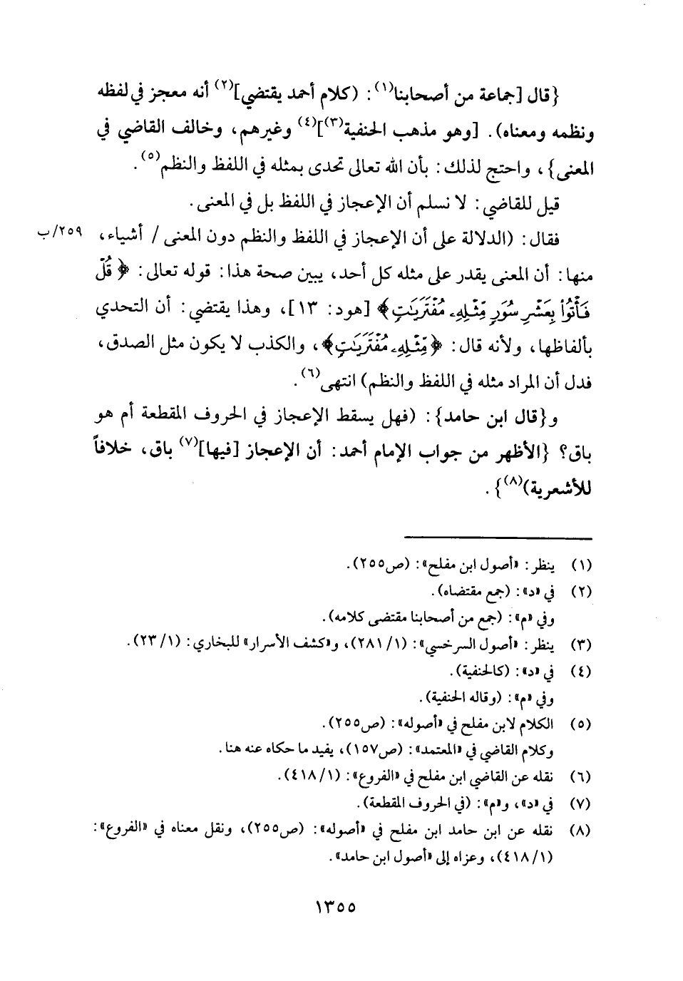 {قَالَ [جمَاعَة من أَصْحَابنَا: (كَلَام أَحْمد يَقْتَضِي] أَنه معجز فِي لَفظه ونظمه وَمَعْنَاهُ) . [وَهُوَ مَذْهَب الْحَنَفِيَّة] وَغَيرهم، وَخَالف القَاضِي فِي الْمَعْنى} ، وَاحْتج لذَلِك: بِأَن الله تَعَالَى تحدى بِمثلِهِ فِي اللَّفْظ وَالنّظم.