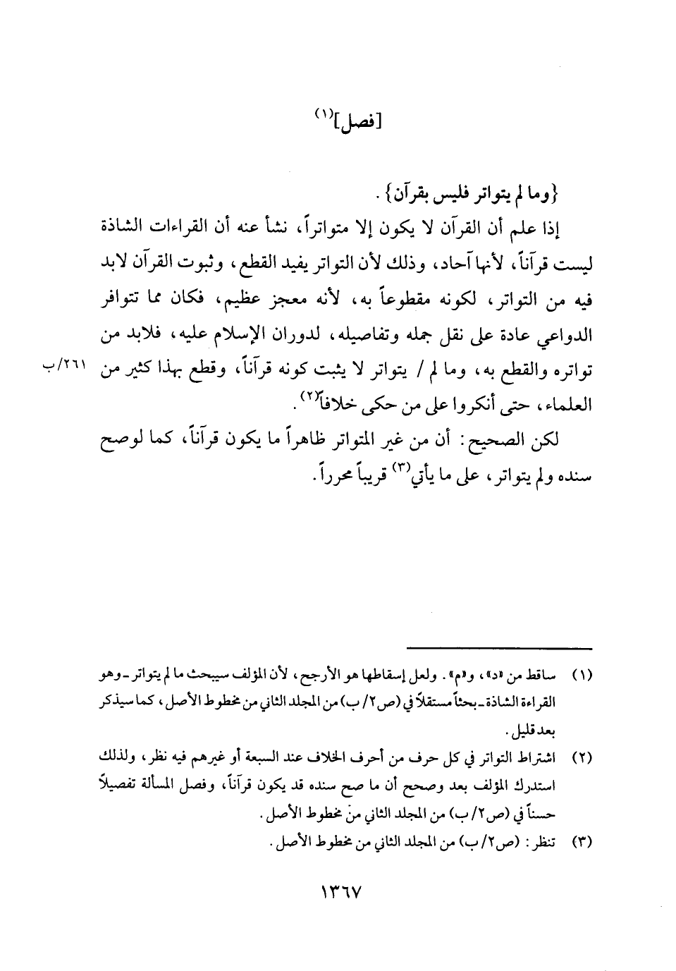إِذا علم أَن الْقُرْآن لَا يكون إِلَّا متواترا، نَشأ عَنهُ أَن الْقرَاءَات الشاذة لَيست قُرْآنًا، لِأَنَّهَا آحَاد، وَذَلِكَ لِأَن التَّوَاتُر يُفِيد الْقطع، وَثُبُوت الْقُرْآن لَا بُد فِيهِ من التَّوَاتُر، لكَونه مَقْطُوعًا بِهِ، لِأَنَّهُ معجز عَظِيم، فَكَانَ مِمَّا تتوافر الدَّوَاعِي عَادَة على نقل جمله وتفاصيله، لدوران الْإِسْلَام عَلَيْهِ، فَلَا بُد من تواتره وَالْقطع بِهِ، وَمَا لم يتواتر لَا يثبت كَونه قُرْآنًا، وَقطع بِهَذَا كثير من الْعلمَاء، حَتَّى أَنْكَرُوا على من حكى خلافًا.