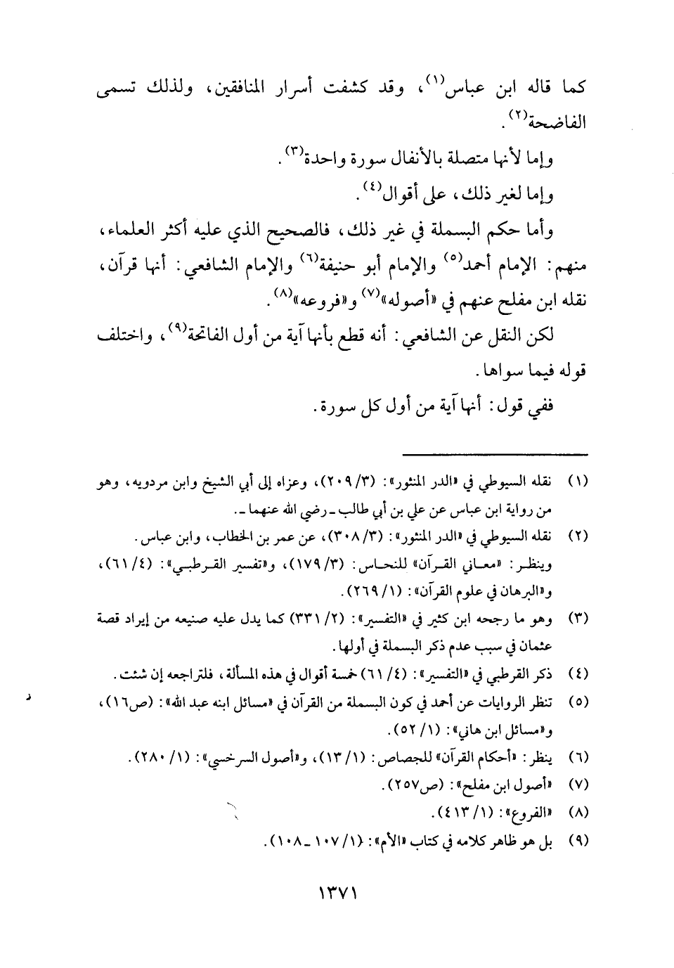 وَأما حكم الْبَسْمَلَة فِي غير ذَلِك، فَالصَّحِيح الَّذِي عَلَيْهِ أَكثر الْعلمَاء، مِنْهُم: الإِمَام أَحْمد وَالْإِمَام أَبُو حنيفَة وَالْإِمَام الشَّافِعِي: أَنَّهَا قُرْآن، نَقله ابْن مُفْلِح عَنْهُم فِي " أُصُوله " و " فروعه ".