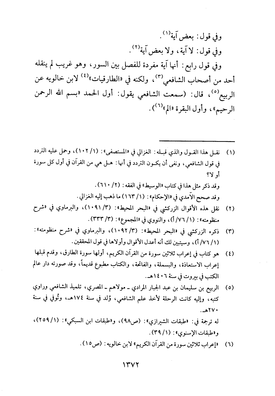 وَفِي قَول رَابِع: أَنَّهَا آيَة مُفْردَة للفصل بَين السُّور، وَهُوَ غَرِيب لم يَنْقُلهُ أحد من أَصْحَاب الشَّافِعِي، وَلكنه فِي " الطارقيات " لِابْنِ خالويه عَن الرّبيع، قَالَ: (سَمِعت الشَّافِعِي يَقُول: أول الْحَمد " بِسم الله الرَّحْمَن الرَّحِيم "، وَأول الْبَقَرَة " الم ") .