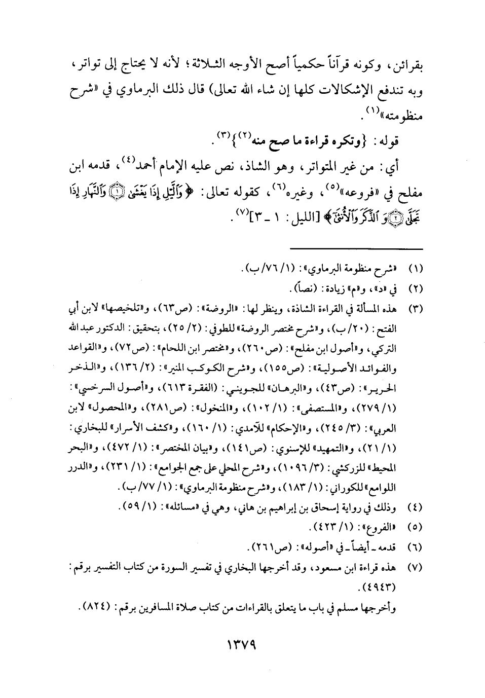 بقرائن، وَكَونه قُرْآنًا حكميا أصح الْأَوْجه الثَّلَاثَة؛ لِأَنَّهُ لَا يحْتَاج إِلَى تَوَاتر، وَبِه تنْدَفع الإشكالات كلهَا إِن شَاءَ الله تَعَالَى) قَالَ ذَلِك الْبرمَاوِيّ فِي " شرح منظومته ".