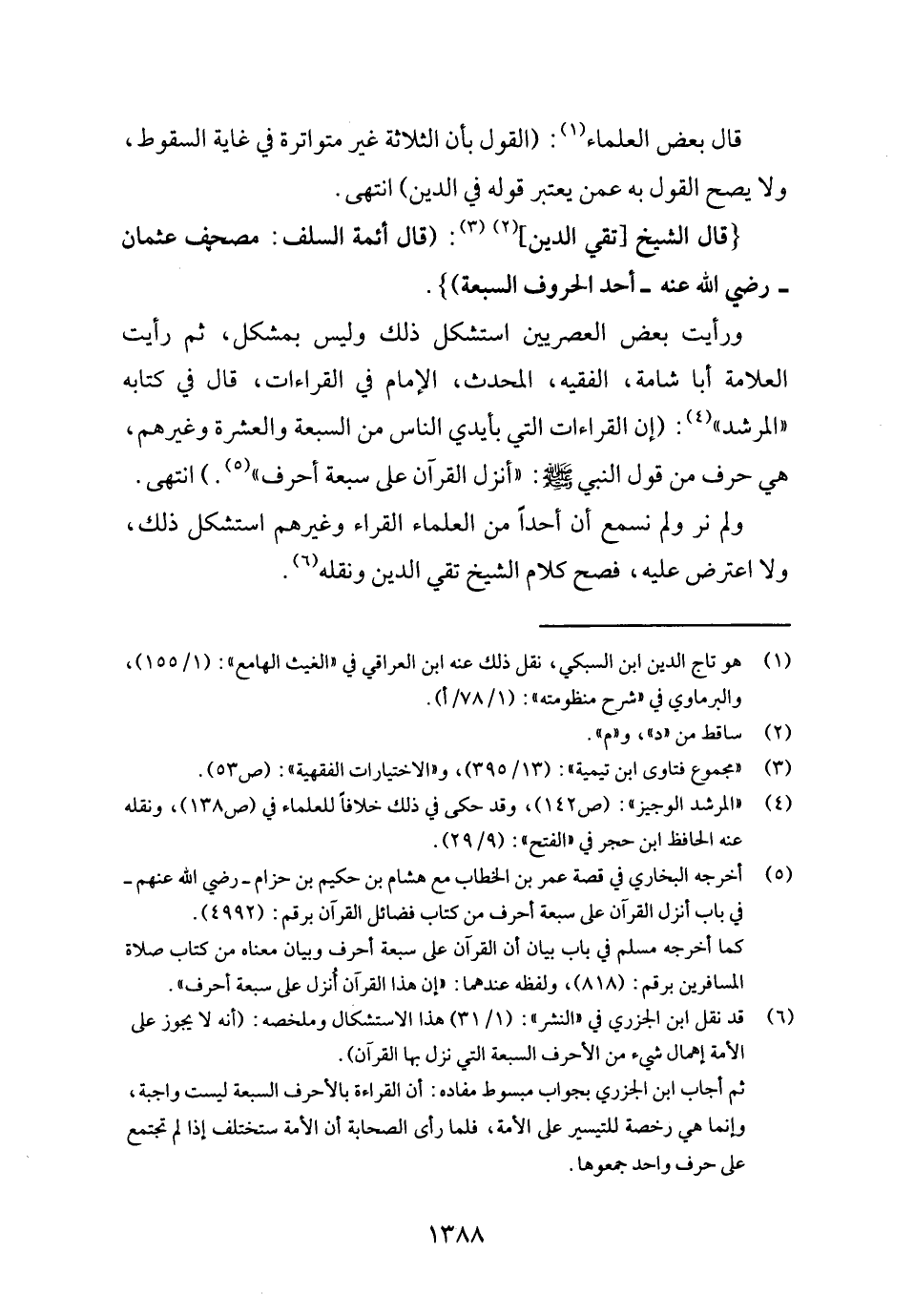 {قَالَ الشَّيْخ [تَقِيّ الدّين] : (قَالَ أَئِمَّة السّلف: مصحف عُثْمَان - رَضِي الله عَنهُ - أحد الْحُرُوف السَّبْعَة} .